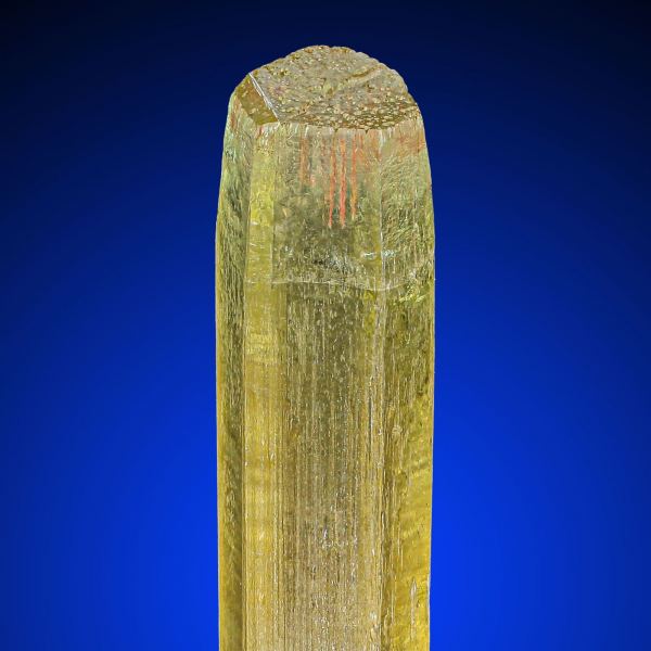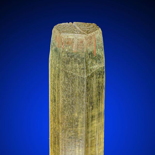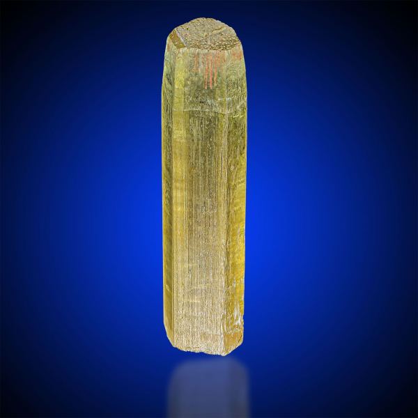 This is a classic, doubly terminated Heliodor from this well known Brazilien locale. This single crystal is of super quality. It is gemmy and features a fine yellow colour with a slightly tapering termination, which is a bit lighter . Some edges at the major termiantion are beautifully bevelled and this termiantion has an interesting pattern as well as the prism faces. A very good and aesthetic specimen, pristine all around.Data last checked on 31st Dec 2021 - specimen may no longer be available