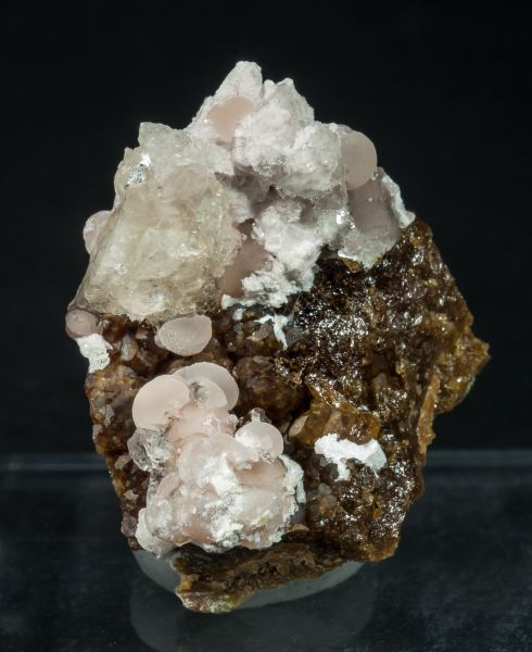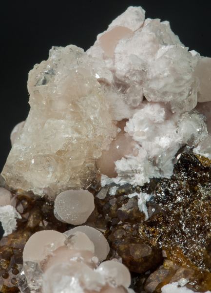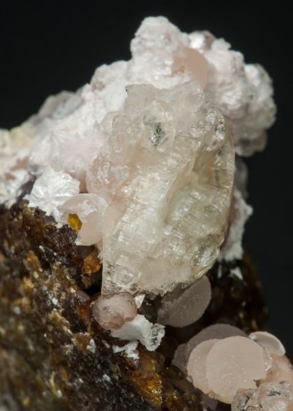 A novelty in the summer of 2021 and, in all likelihood, the best known for the species thus far. Imayoshiite occurs in numerous very sharp crystals, with a tabular habit and hexagonal outline, transparent, very lustrous and colorless to slightly yellow, associated with spheroidal growths of pinkish Bultfonteinite, with small white fibrous coatings of Tobermorite (Group) and on an Andradite matrix. The specimens have been analyzed and we will send a copy of the analysis to the buyer.