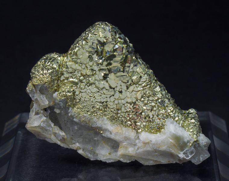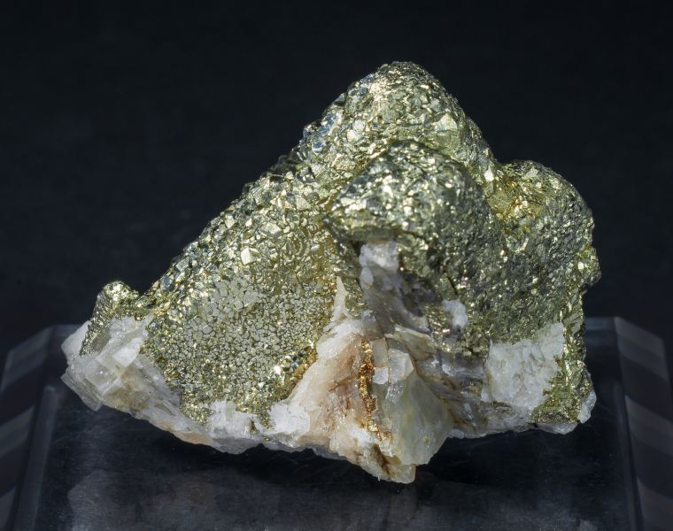 A novelty from Morocco, from a discovery in the summer of 2020. White tabular crystals of Baryte partially covered by a perimorphic growth of a mosaic of small, very bright, cubic and octahedral Pyrite crystals. Bou Nahas Mine, Oumjrane mining area, Alnif Commune, Tinghir Province, Drâa-Tafilalet Region Morocco (07/2020)