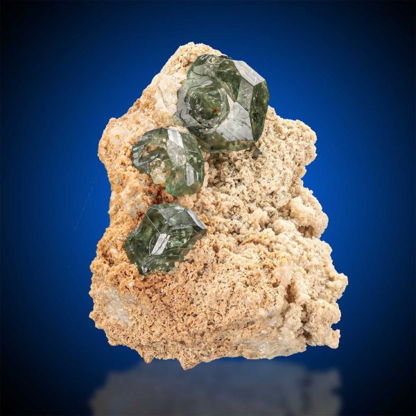 This is a superb mini of glassy large crystals with intense green colour and a superb multifacing. This super beauty features 3 glassy and gemmy crystals of Andratite variety Demantoid slightly isolated on typically matrix and when crystals are isolated from each other, like this, the maximum beauty of each is enhanced to the eye. Two crystals, especially the major crystal exhibit clear evidence of hopper growth, rarely seen in the garnet family of minerals. The crystals are extremely large for Demantoid and the overall aesthetic is insane good. Just a mini, but what one Data last checked on 31st Dec 2021 - specimen may no longer be available