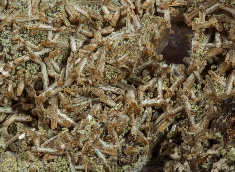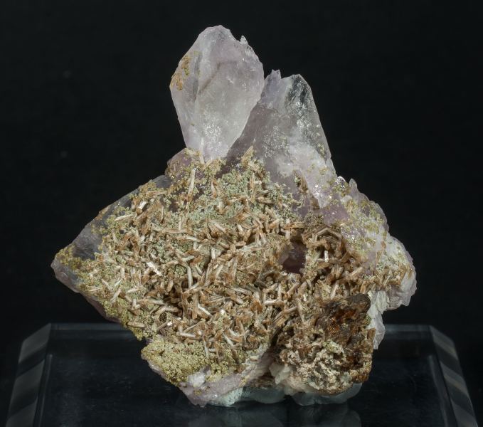 Druse of Quartz crystals (rose quartz variety) with polycrystalline terminations, good luster and pink color, on the back of the piece. The front exhibits a multitude of greenish Roscherite crystals, a rare phosphate of calcium, manganese and beryllium. This combo is completed by a multitude of prismatic, doubly terminated and lustrous light brown crystals of Eosphorite, a manganese and aluminum phosphate of secondary origin in phosphate-bearing granitic pegmatites. This specimen is a good example of that.Ilha claim, Taquaral, Itinga, Jequitinhonha, Minas Gerais Brazil