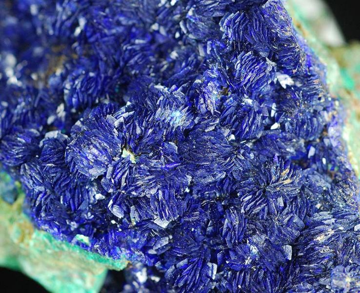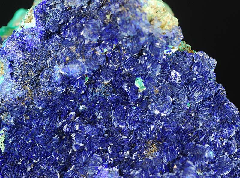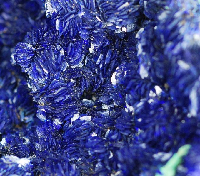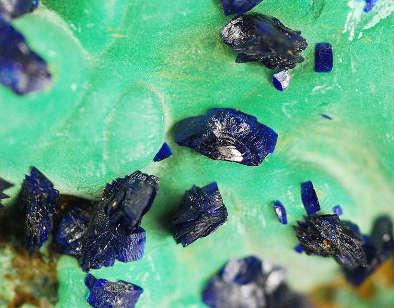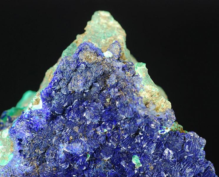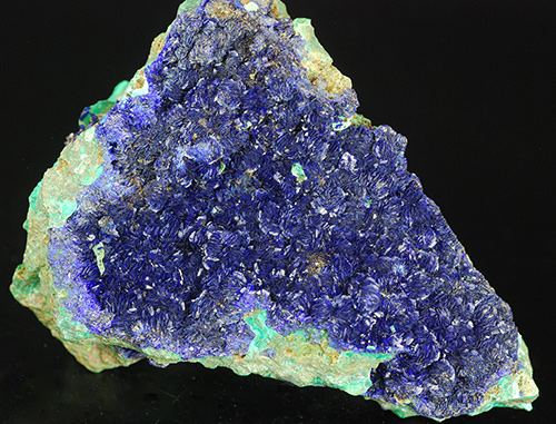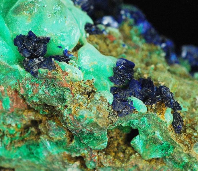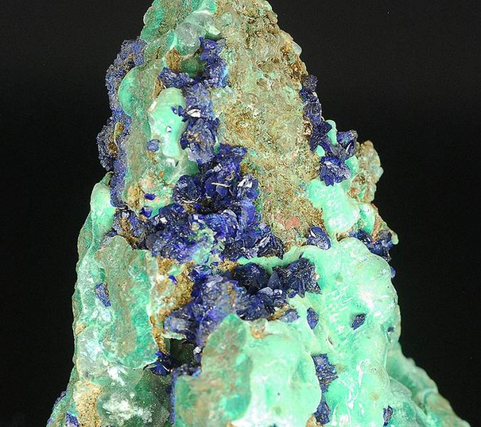 This cluster is made by green bulky malachite and is completely covered by dark blue and brilliant blades of azurite. Some crystals of azurite are visible in a vug and in the bottom too. The pictures are overlightened to show the detai (Gmineral Gallery)Data last checked on 5th Jan 2022 - specimen may no longer be available