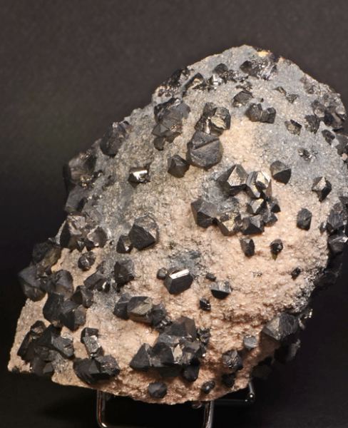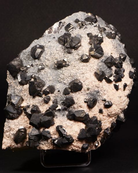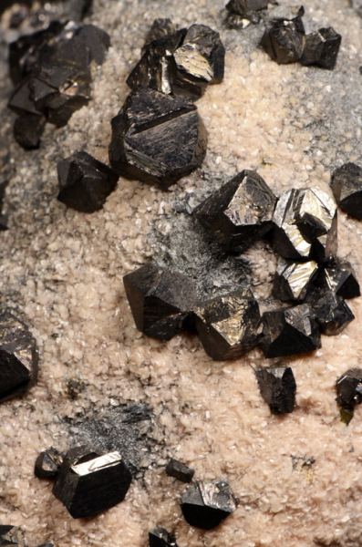 Fine cluster featuring lots of black tetrahedra of Sphalerite scattered on a bed of pinkish rhodochrosite, from one of the most famous european locale, now definitely closed.Showy! (Ferrero Gallery)Data last checked on 5th Jan 2022 - specimen may no longer be available