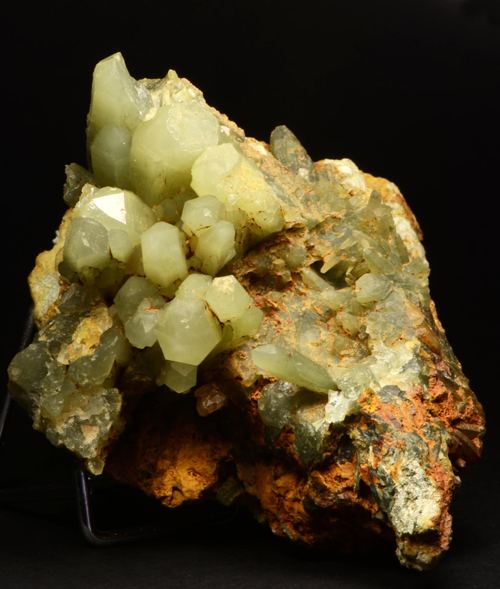 Classic cluster featuring several prismatic xls of quartz, showing a bright green colour (var. Prase).The Xls are spread over a skarn matrix, with hedembergite.The locality called Porticciolo that is the unique site of the historic (Ferrero Gallery)Data last checked on 5th Jan 2022 - specimen may no longer be available