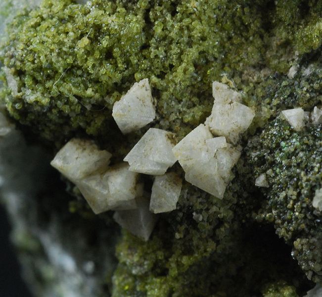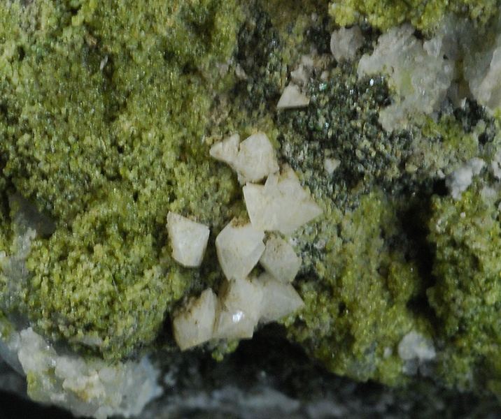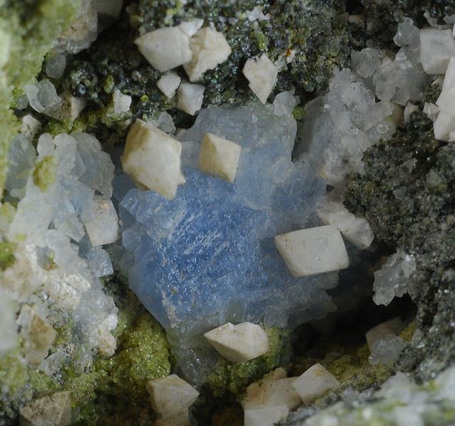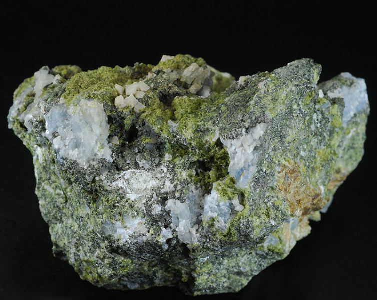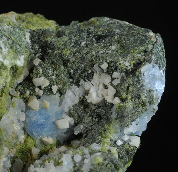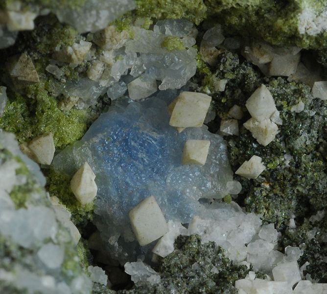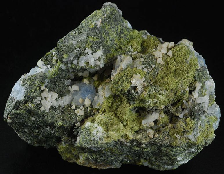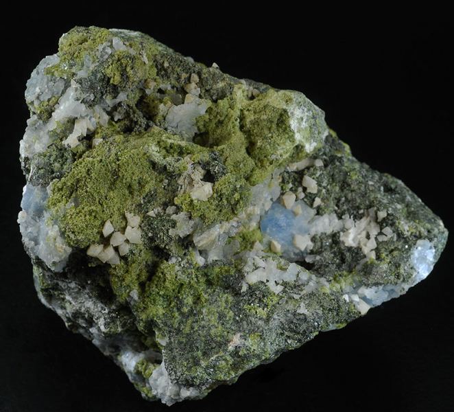 Some pearl white, dipyramidal crystals of gismondine are seeded over the surface of the specimen.They make a strong contrast with the green microcrystals of epidotes and with the bluish massive calcite. (Gmineral Gallery)Data last checked on 5th Jan 2022 - specimen may no longer be available