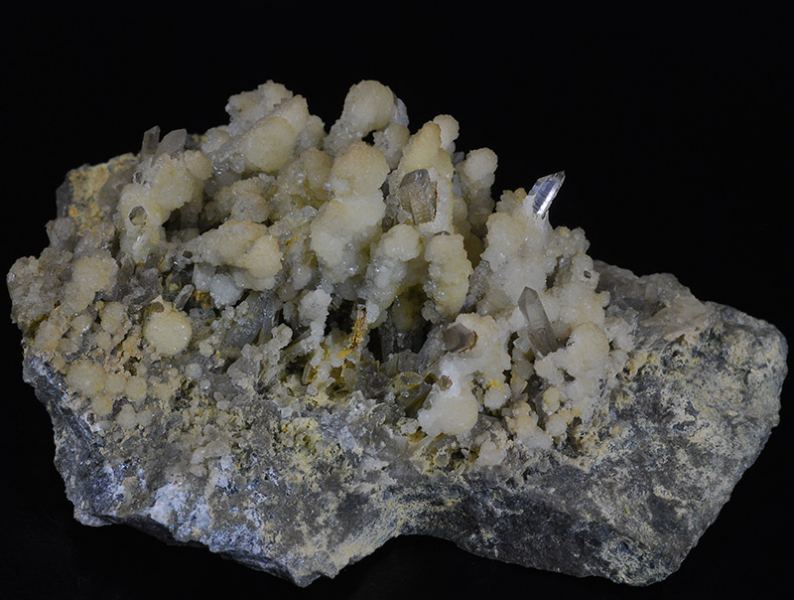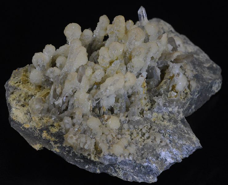 Classic specimen of wavellite from this bolivian mine: the botryoidal creamy coloured crystals of wavellite are grown over the long hyalin quartzes.It's typical from this location. (Gmineral Gallery)Data last checked on 5th Jan 2022 - specimen may no longer be available