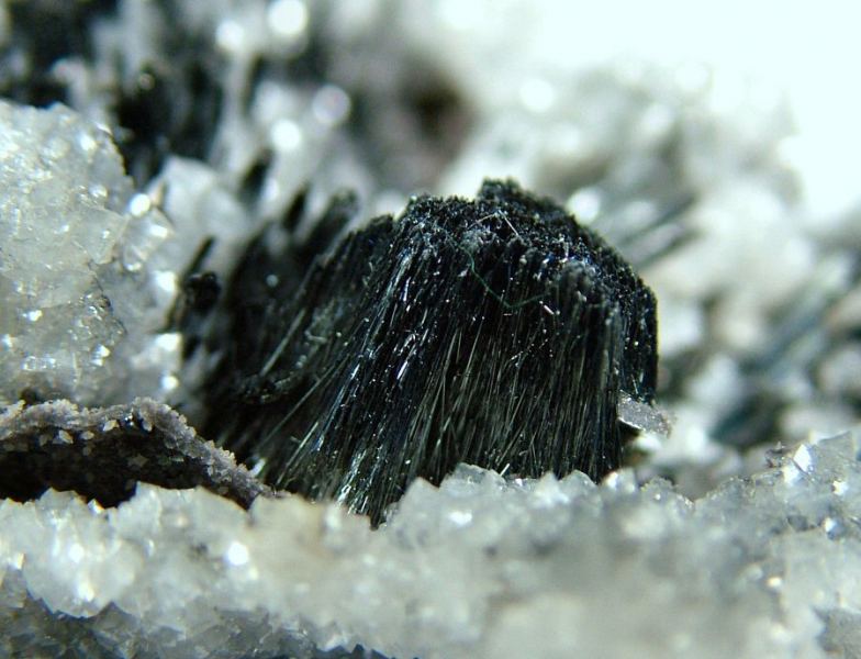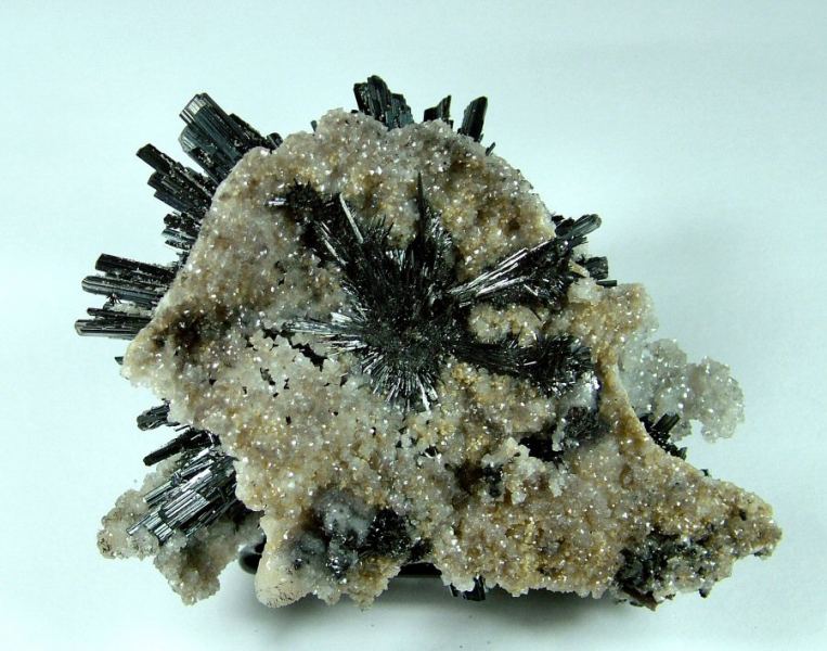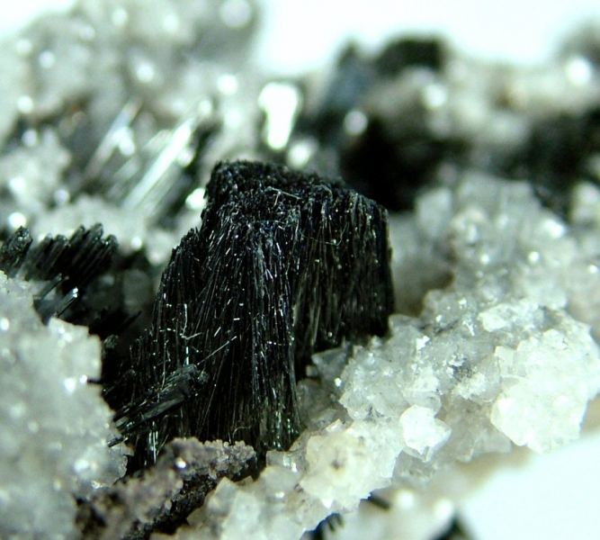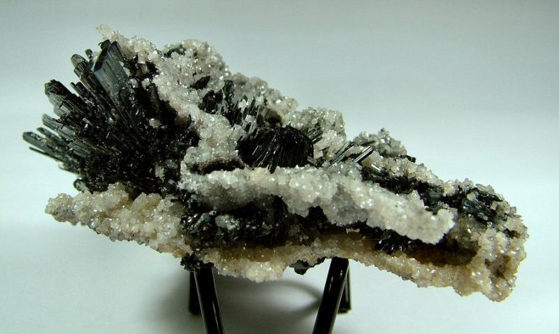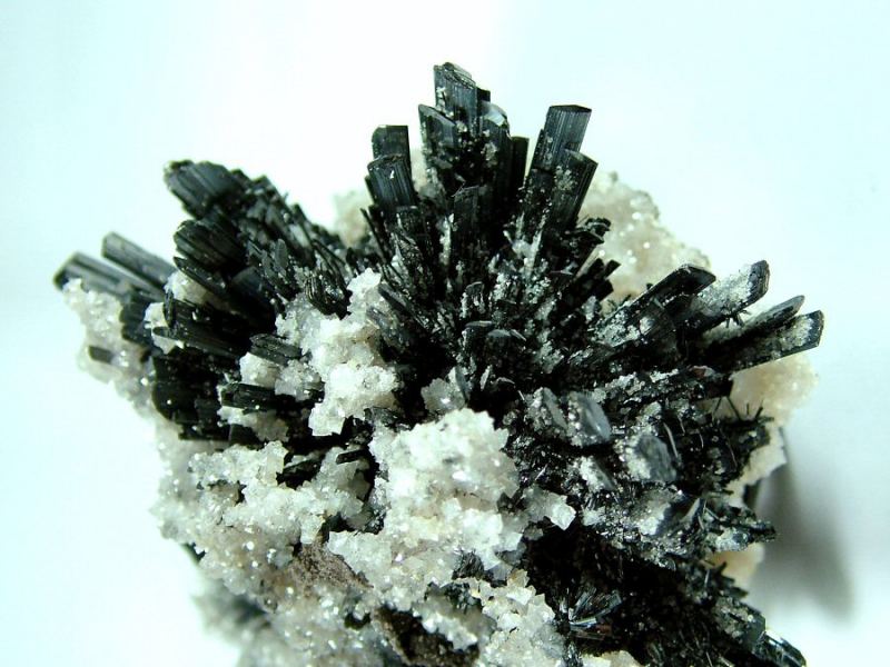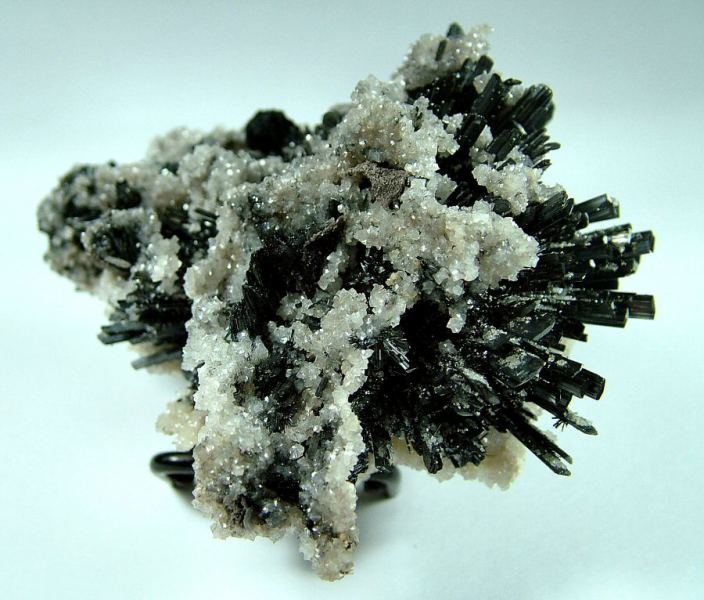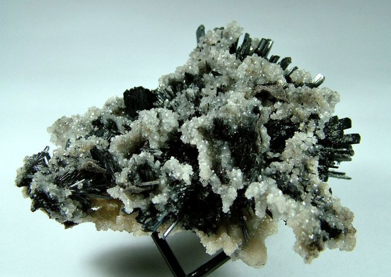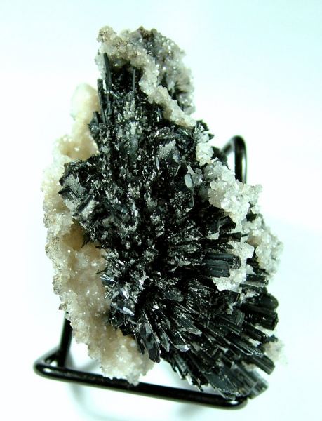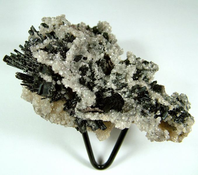 A myriad of little white Calcite's crystals covers tufts of glossy, well-terminated Stibnite crystals (25 mm), placed in an elegant way on the sample. There's a 10 mm Berthierite's crystals aggregate, with needle-shaped crystals, accre (Silvia Gallery)Data last checked on 5th Jan 2022 - specimen may no longer be available