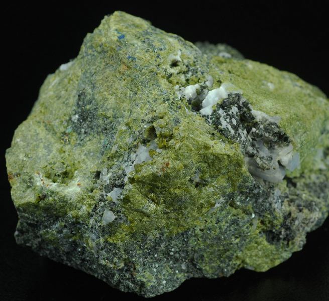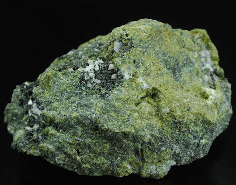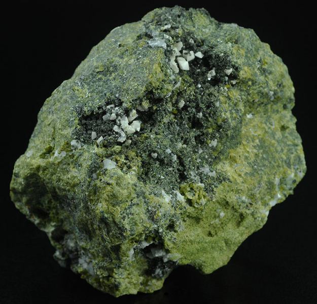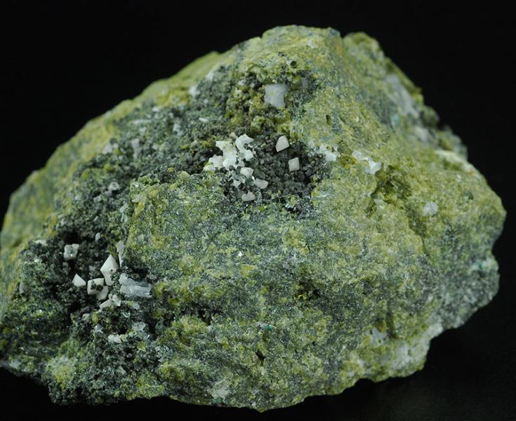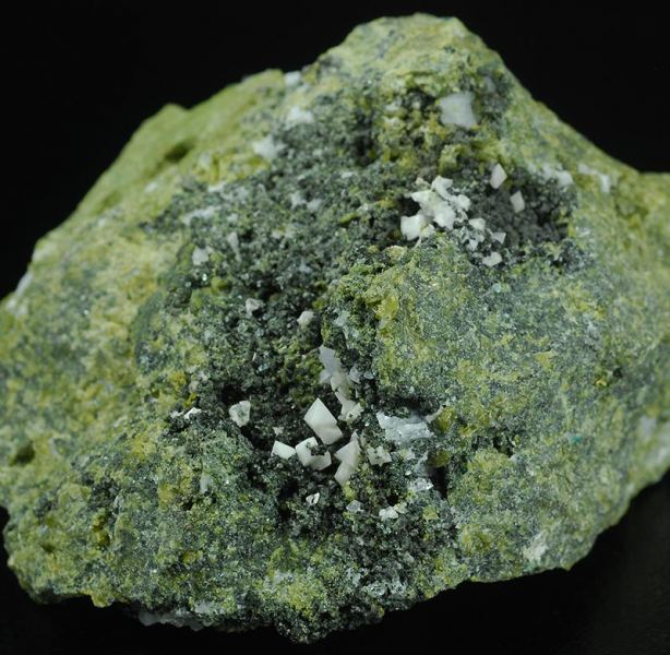 Some pearl white, dipyramidal crystals of gismondine are seeded over the surface of the specimen.They make a strong contrast with the green microcrystals of epidotes and with the whitish massive calcite.Data last checked on 5th Jan 2022 - specimen may no longer be available