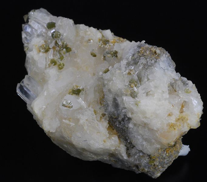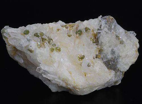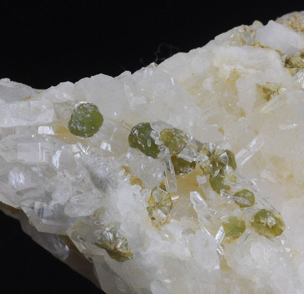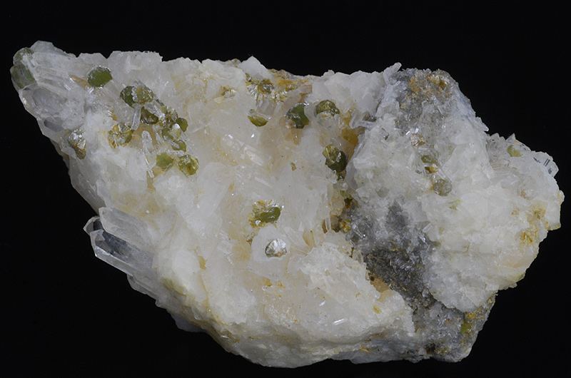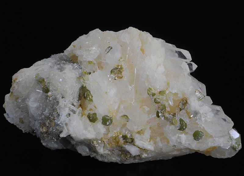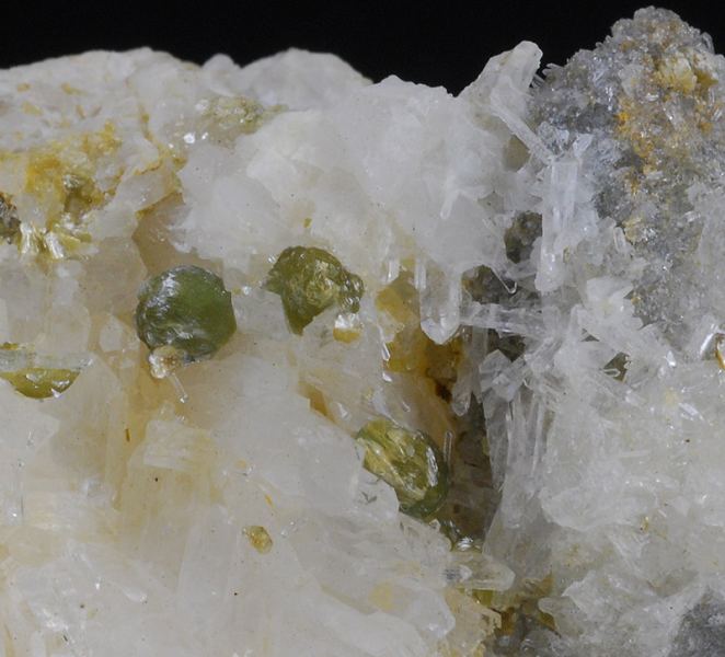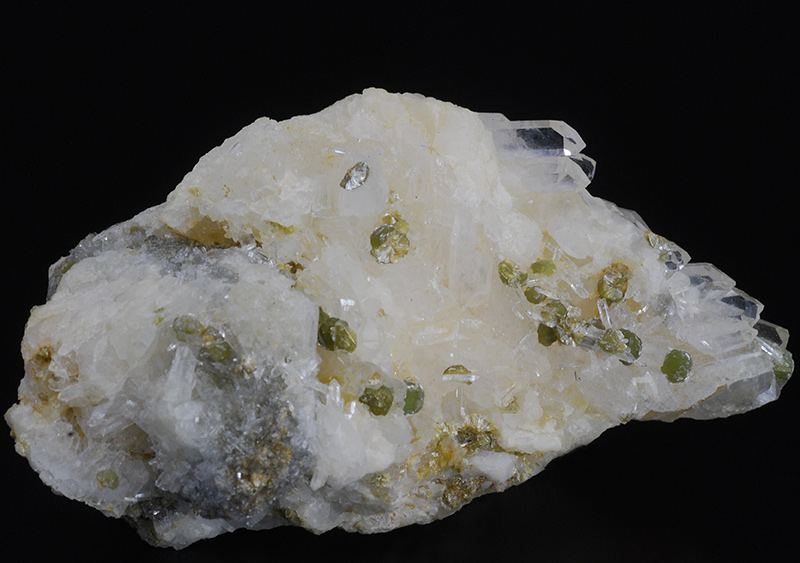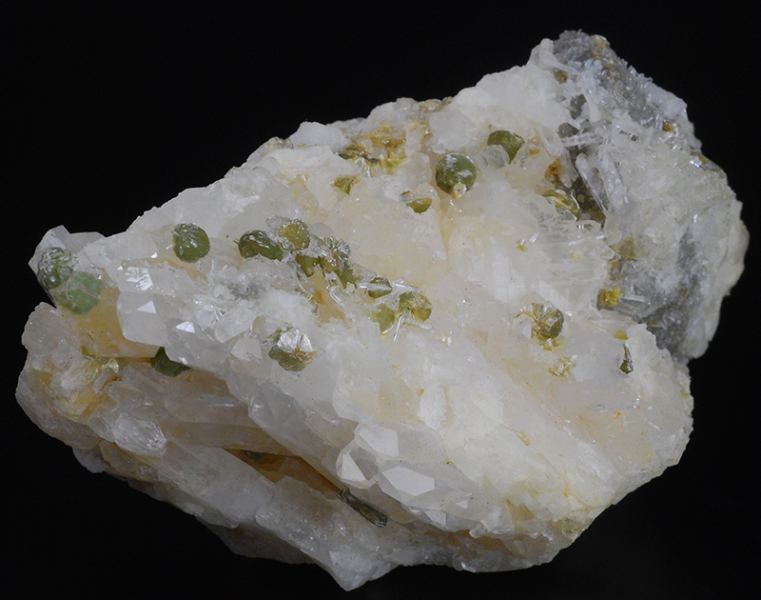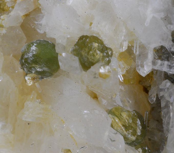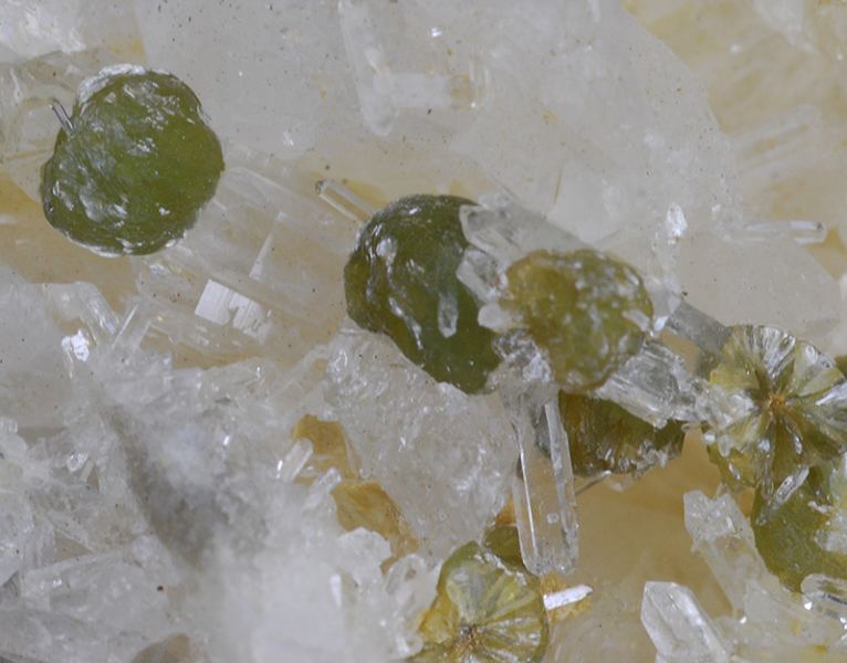 A specimen of cookeite, a lithium mica, on quartz crystals. The cookeite occurs as small grey-green balls, rather like buckshot, on the crystalline quartz. (Gmineral Gallery)Data last checked on 5th Jan 2022 - specimen may no longer be available