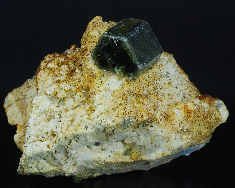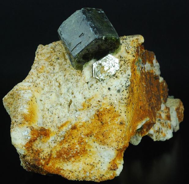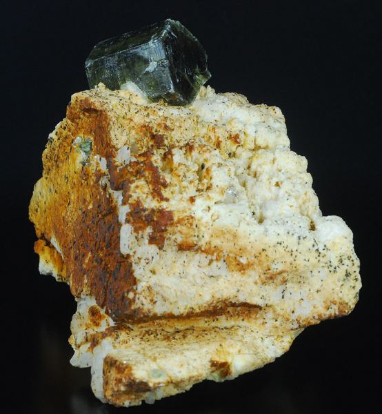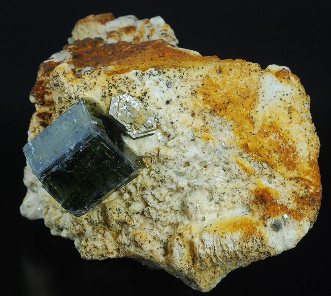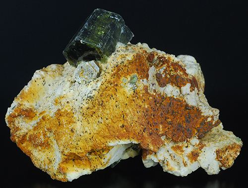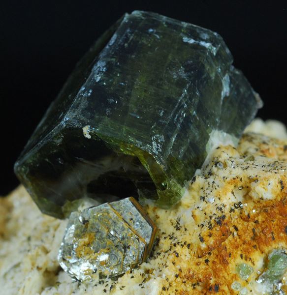 A big, brilliant and dark green coloured crystal of fluorapatite is stunning at the top of the specimen.Some litlle blades of muscovite are placed near it.In the bottom some other smaller crystals of fluorapatite are visible too. (Gmineral Gallery)Data last checked on 5th Jan 2022 - specimen may no longer be available