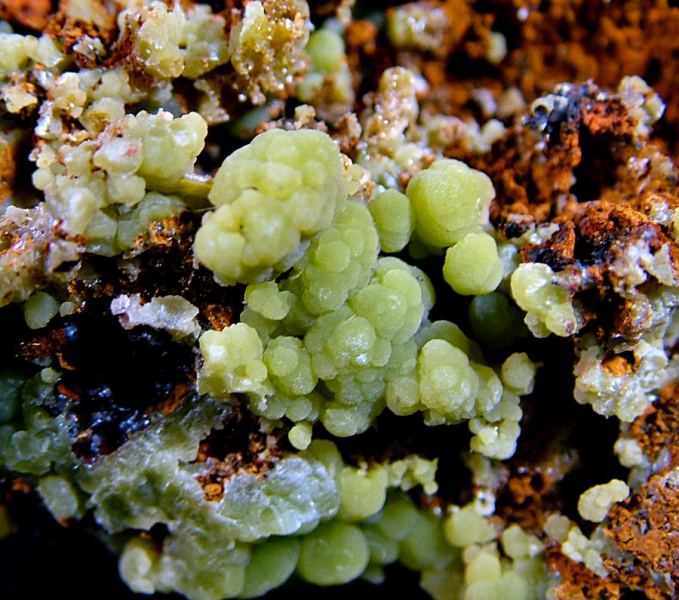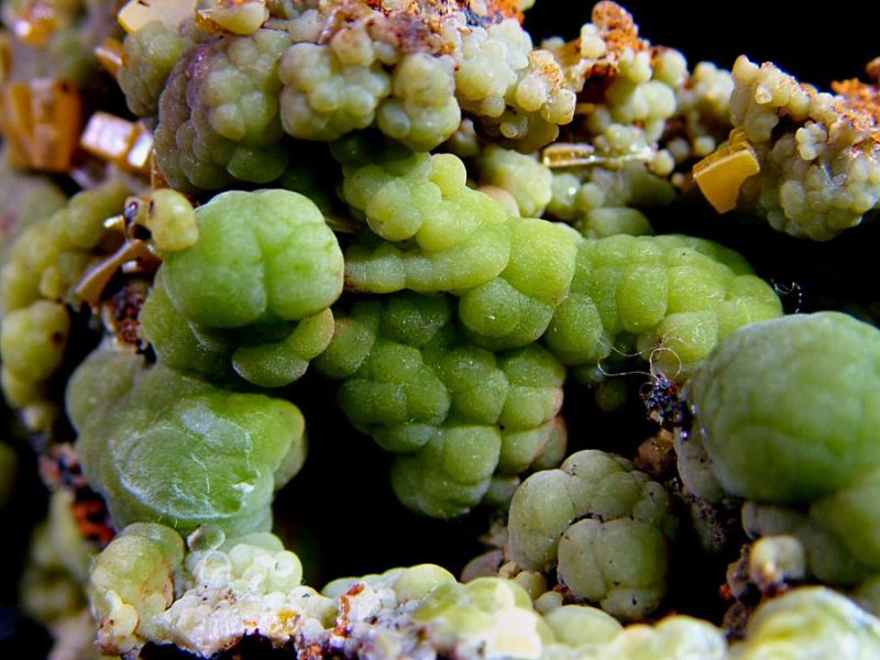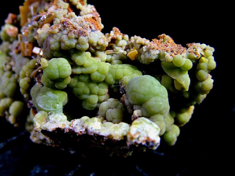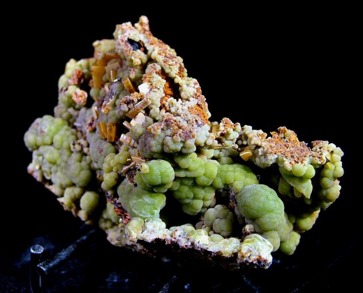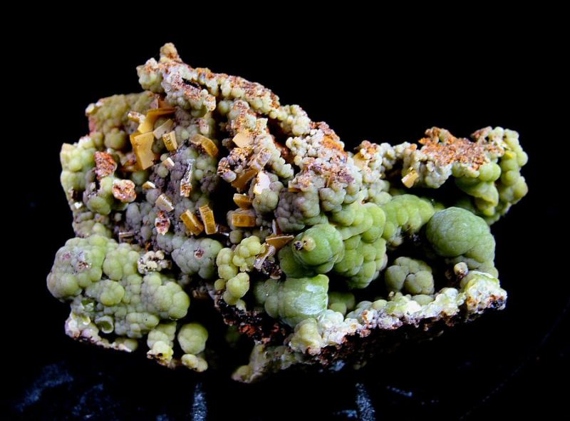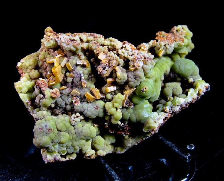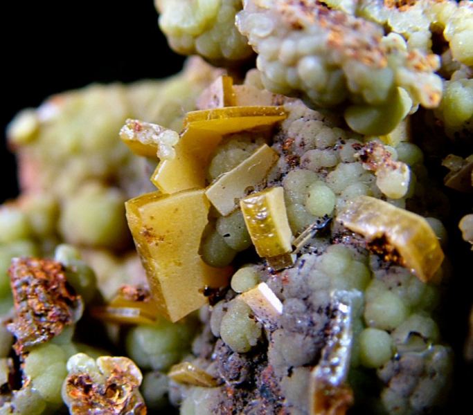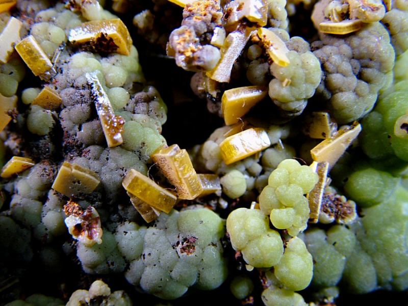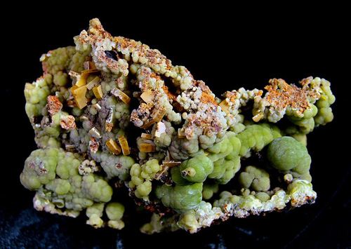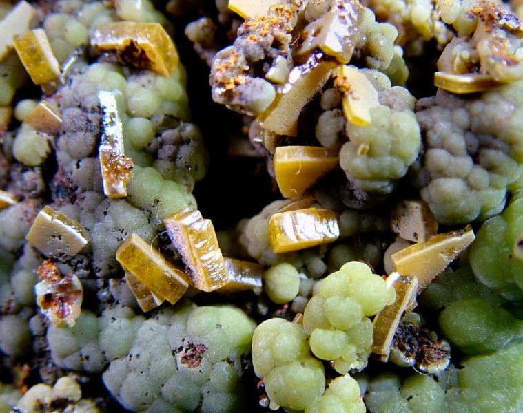 Lustrous yellow Wulfenite's crystals are scattered on a noce green colored mammellonar Mimetite, with a good chromatic contrast. (Silvia Gallery)Data last checked on 5th Jan 2022 - specimen may no longer be available