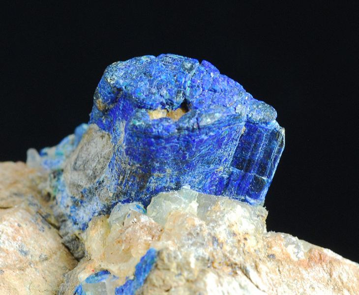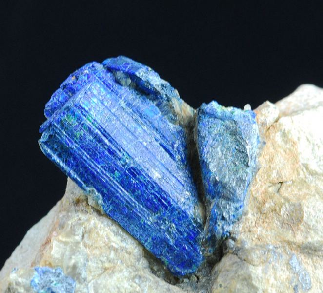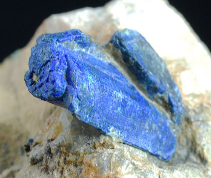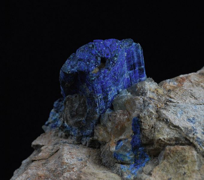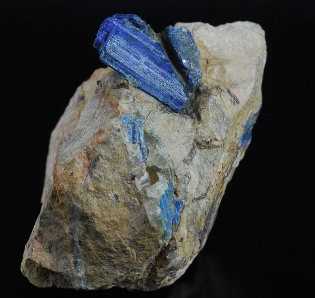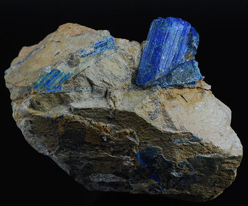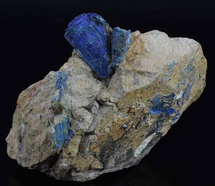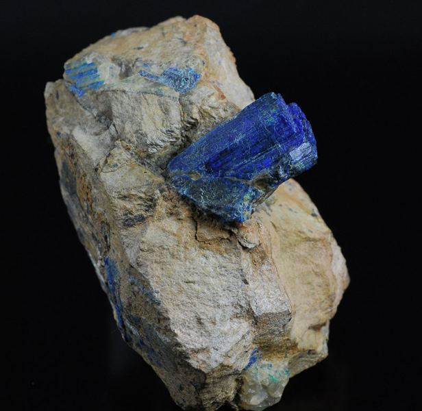 A big crystal of chalcostibite is scattering out from the dolomitic matrix.Another minor is partially intersected with it.Both of them are covered by a thin crust of azurite and malachite, as usual for the specimens from this local (Gmineral Gallery)Data last checked on 5th Jan 2022 - specimen may no longer be available