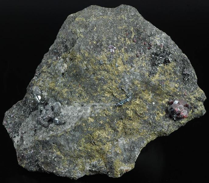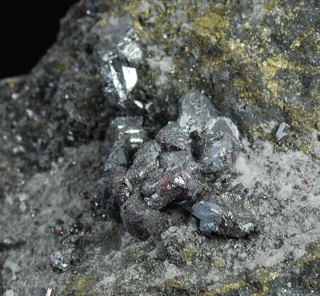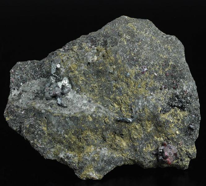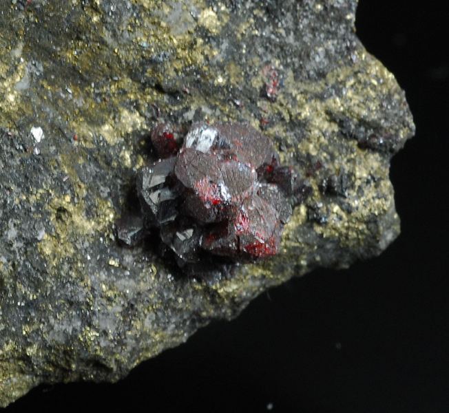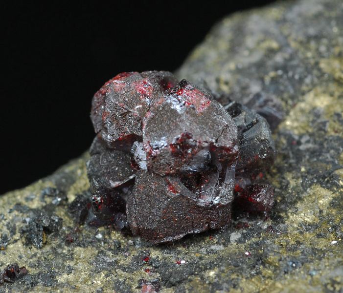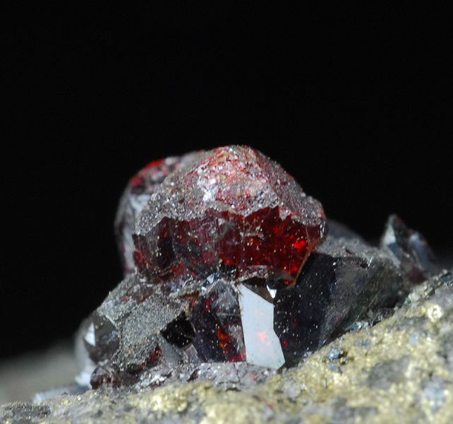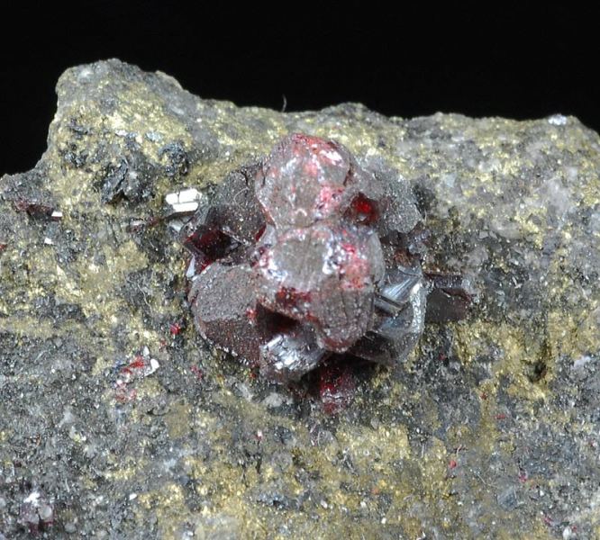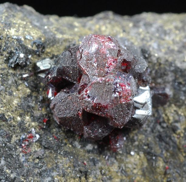 Two evident aggregates of reddish proustite are featuring over this cluster.Some other minor reddish smaller crystals are seeded somewhere.A group of grey methallic with reddish reflections crystals of pyrargirite are visibile too (Gmineral Gallery)Data last checked on 5th Jan 2022 - specimen may no longer be available