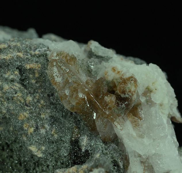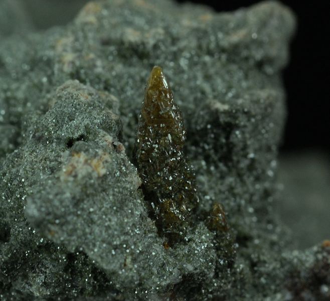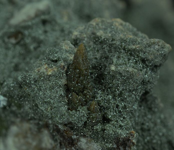 Some brown colored crystals of anatase are seeded over the bulky quartzitic matrix, that is covered by a green chloritic crust.Some of them have an elongated shape.One is covered by chlorite.A group of colorless anatases is surel (Gmineral Gallery)Data last checked on 5th Jan 2022 - specimen may no longer be available