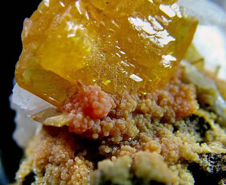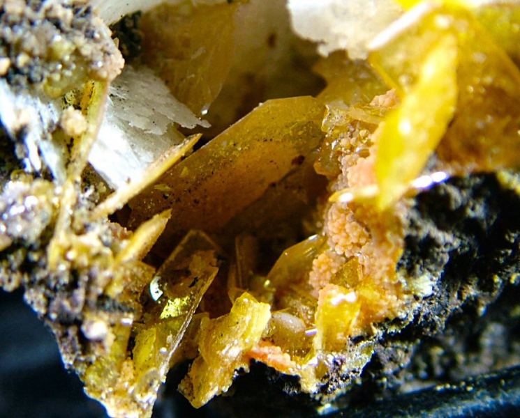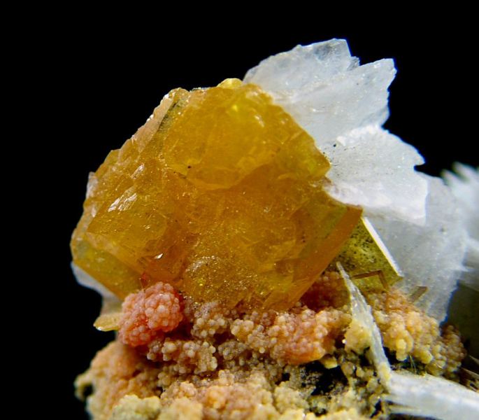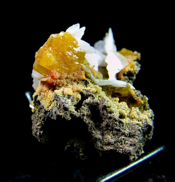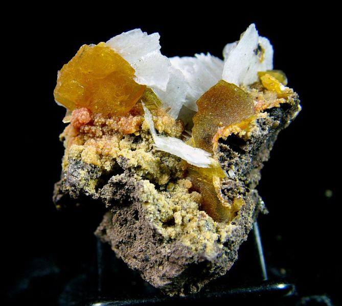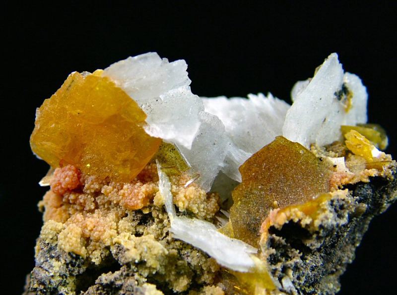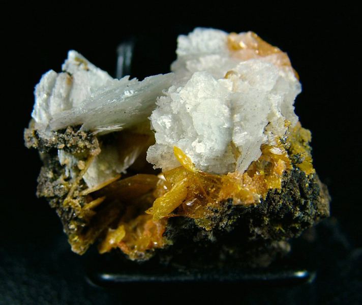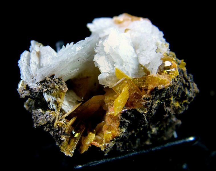 Up to 13 mm yellow Wulfenite, with white Baryte's crystals and orange Mimetite. Aesthetic sample from this locality, with classical paragenesis. (Silvia Gallery)Data last checked on 5th Jan 2022 - specimen may no longer be available