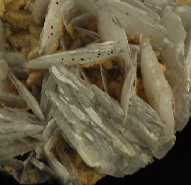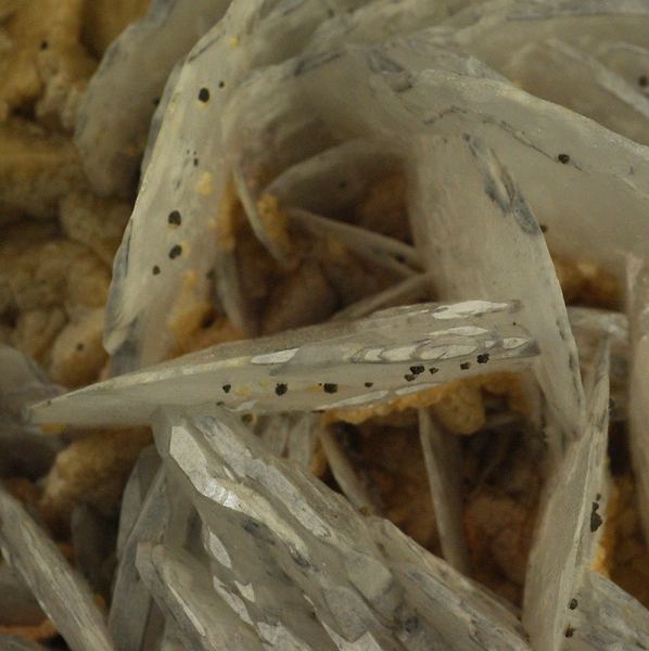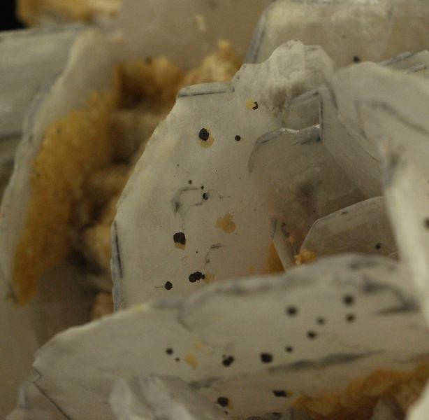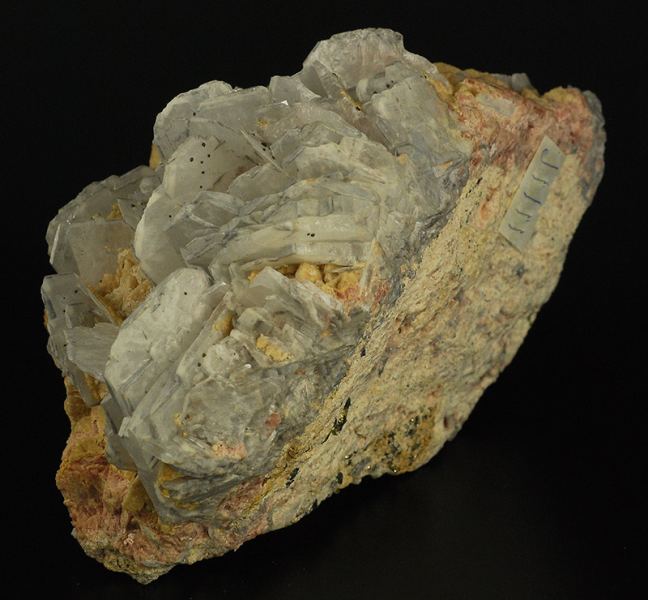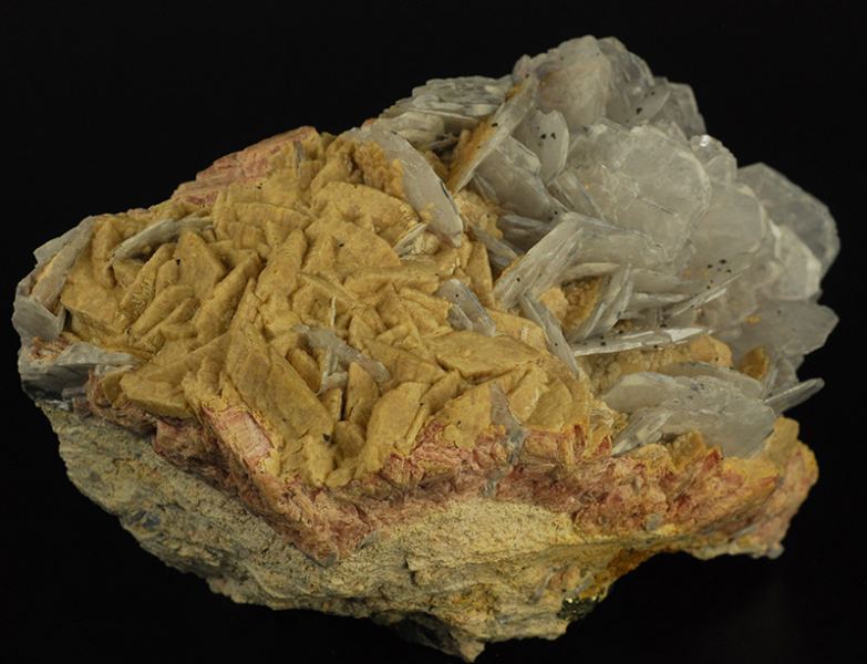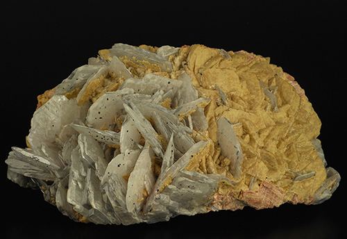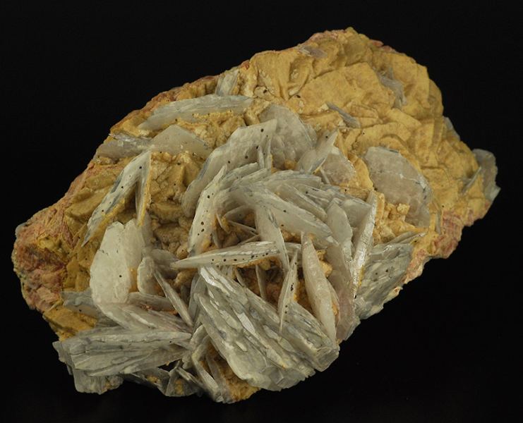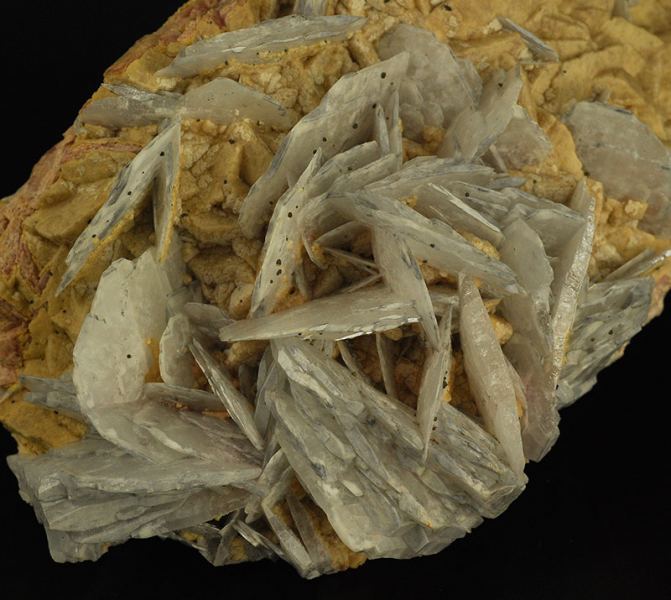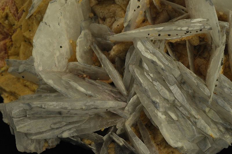 The cluster is covered by pink rhodochrosite: some blades, pale grey-blue colored barytes are grown over it.Some of them are encrusted by yellow-brown carbonate, some others have several black minidots, probably of goethite. (Gmineral Gallery)Data last checked on 5th Jan 2022 - specimen may no longer be available