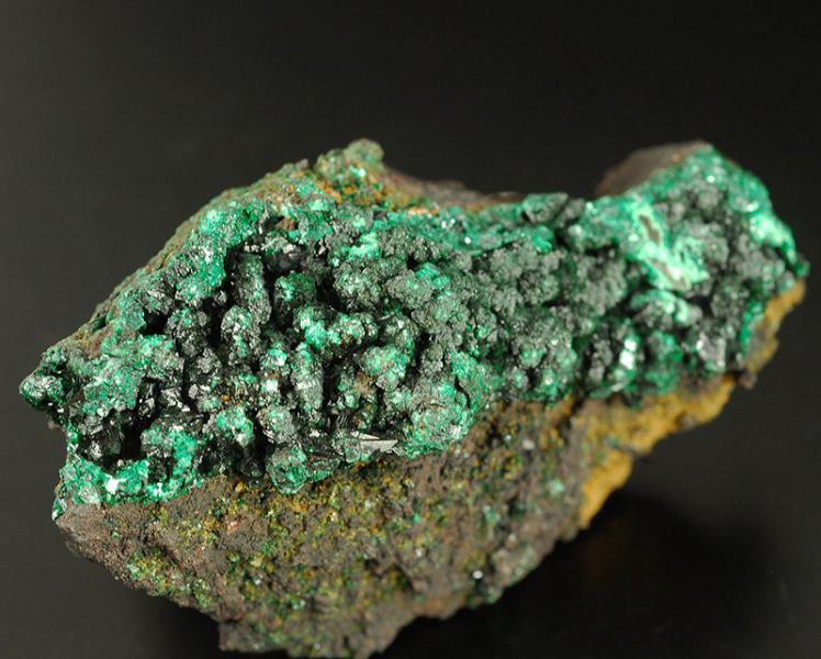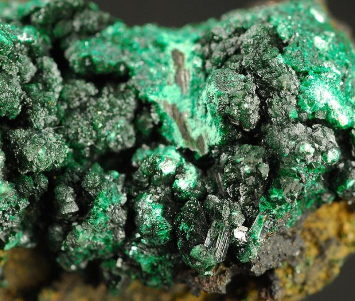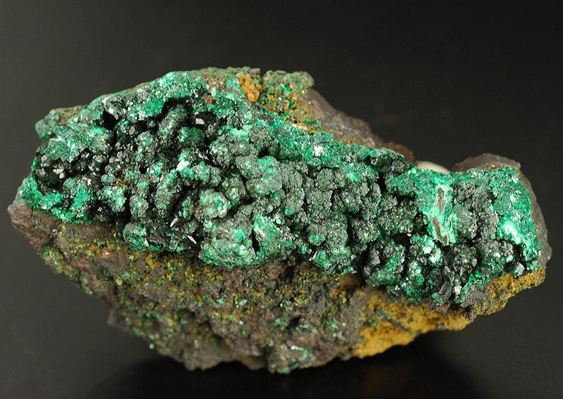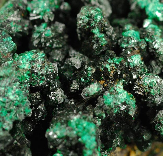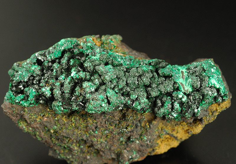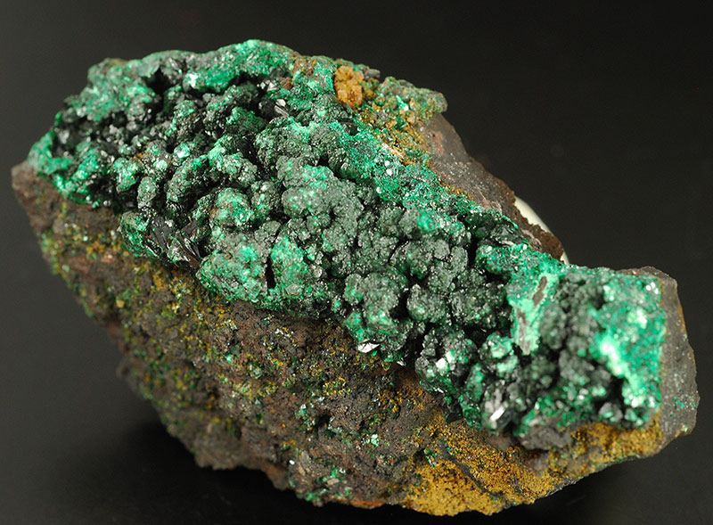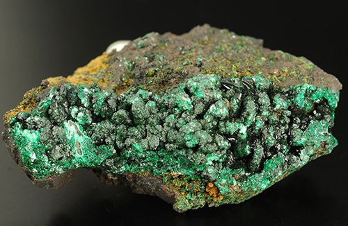 The surface of this specimen is covered by several brilliant and dark black crystals of heterogenite. They are in strong contrast with the green of the malachite. The picctures are a little overlightened to show the details. (Gmineral Gallery)Data last checked on 5th Jan 2022 - specimen may no longer be available