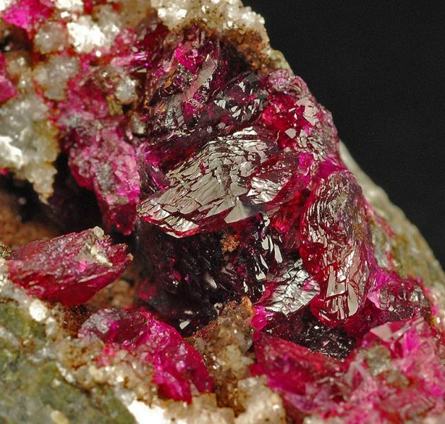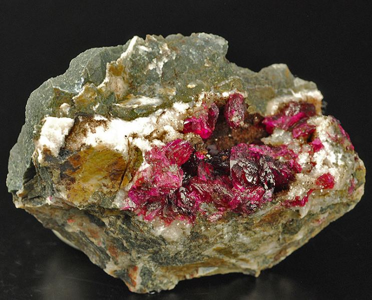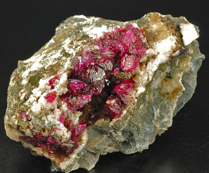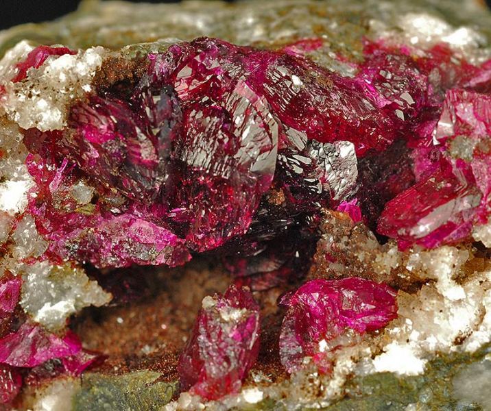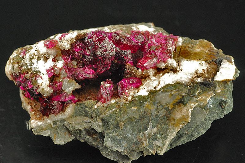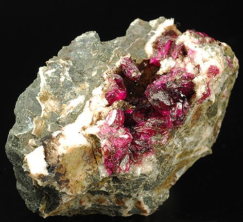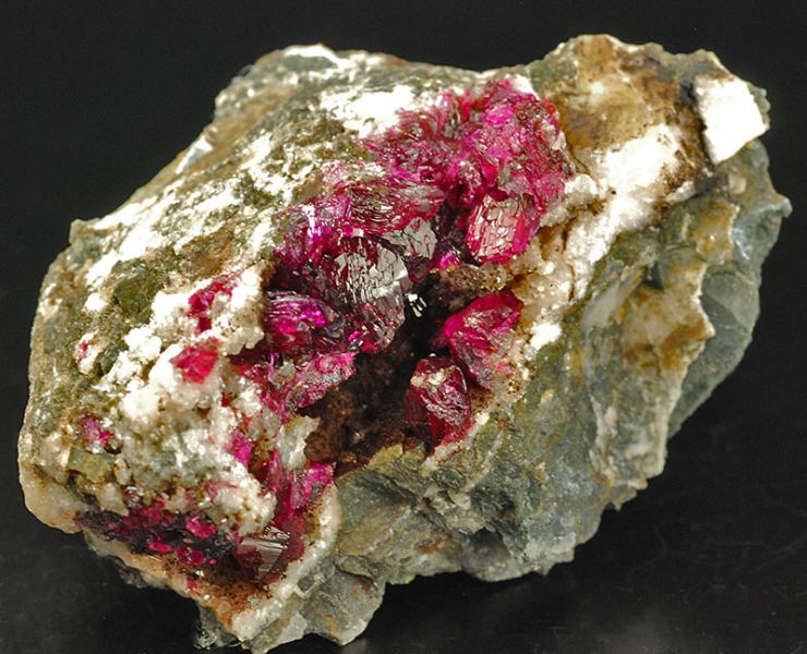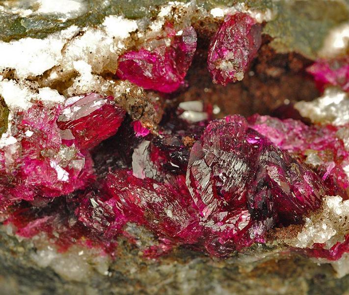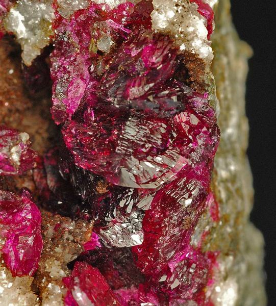 Several dark red crystals of roselite are visible into the vug of this specimen. Some little whitish crystals of calcite are seeded around them.The pictures are a little overlightened to show the details, the real colors are darker (Gmineral Gallery)Data last checked on 5th Jan 2022 - specimen may no longer be available