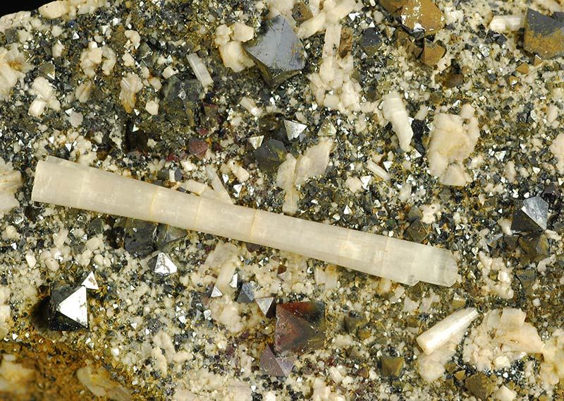 An unusual long white crystals of this uncommon variety of hydroxylapatite is in good evidence over the surface of this specimen: it's seeded among several dark-grey metallic crystals of magnetite. (Gmineral Gallery)Data last checked on 5th Jan 2022 - specimen may no longer be available