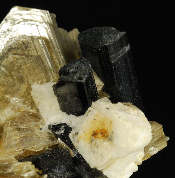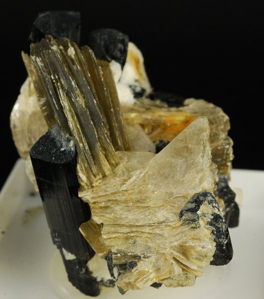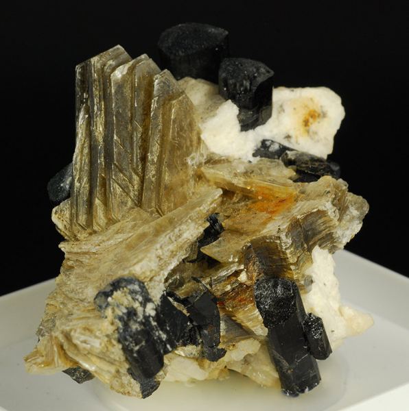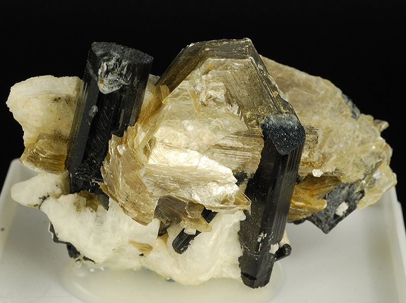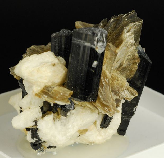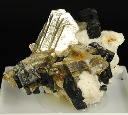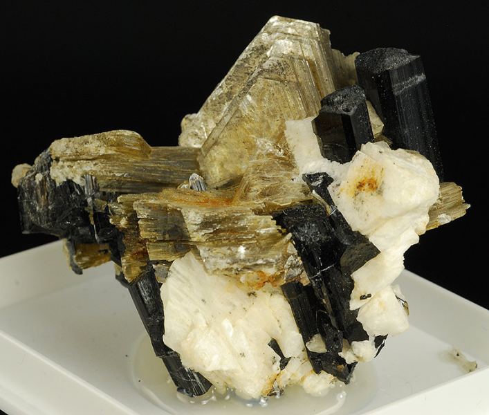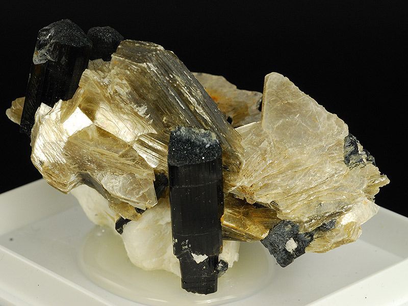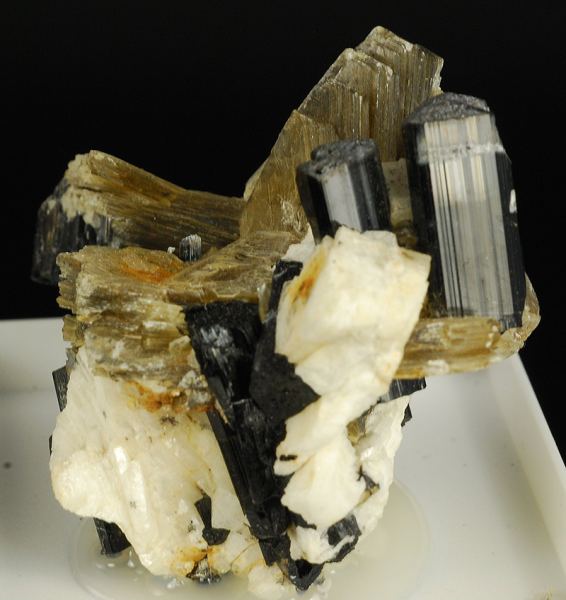 Several crystals of dark colored tourmaline are stunning all around this specimen.They are over a white matrix of albite and mixed with severals thin blades of translucent muscovite.It's glued to the plastic bottom. (Gmineral Gallery)Data last checked on 5th Jan 2022 - specimen may no longer be available