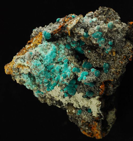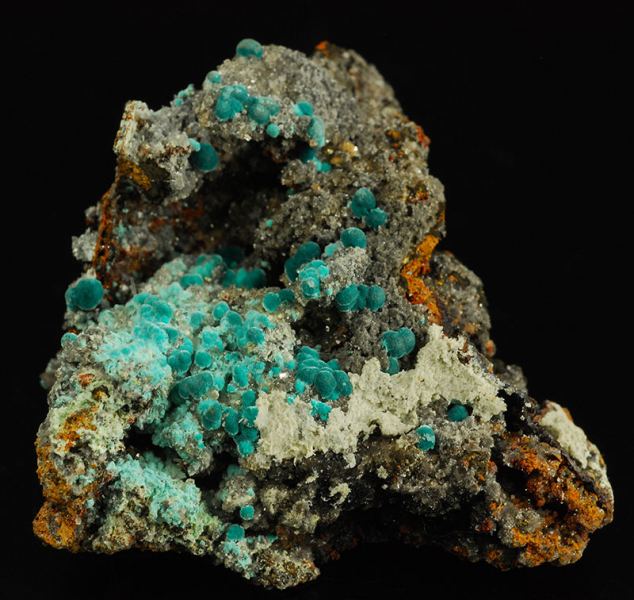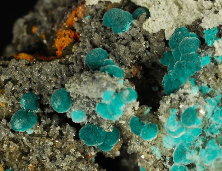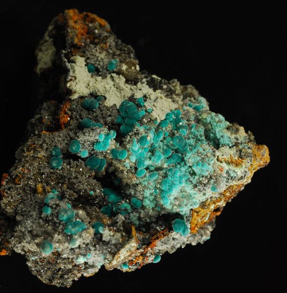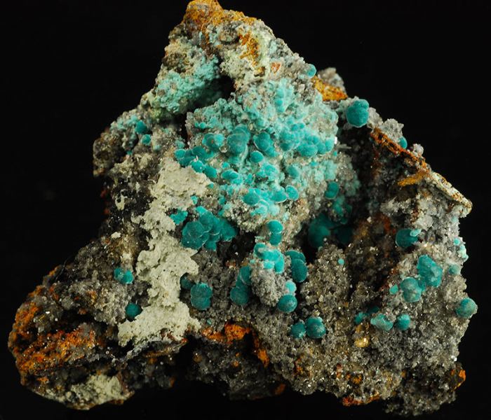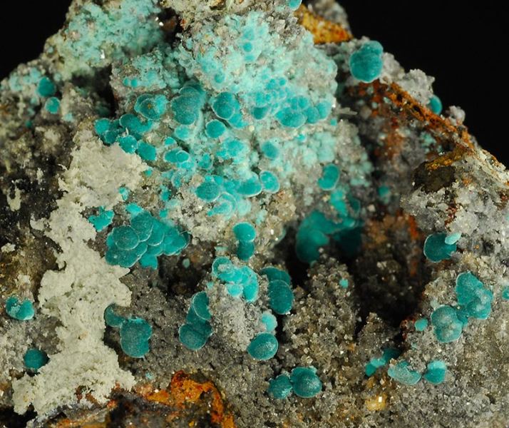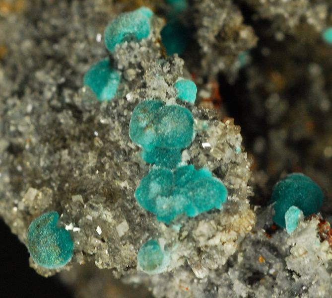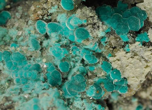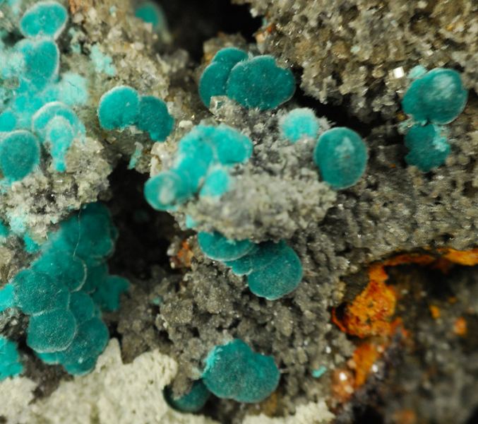 Severale small and green-blue colored sphere of rosasite are spread all over the surface of this specimen.They are surrounded by little and brilliant crystals of gypse. (Gmineral Gallery)Data last checked on 5th Jan 2022 - specimen may no longer be available