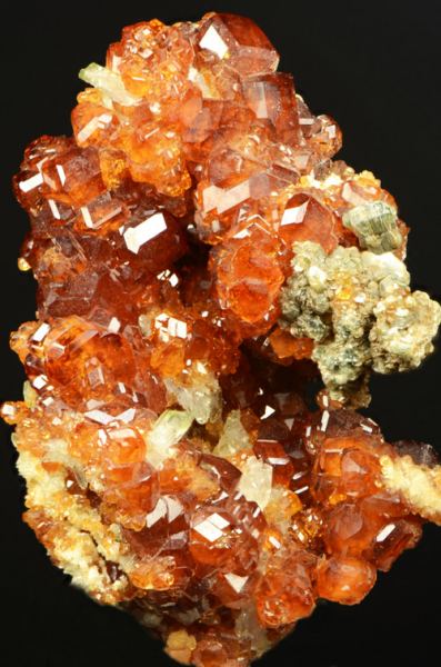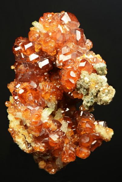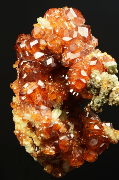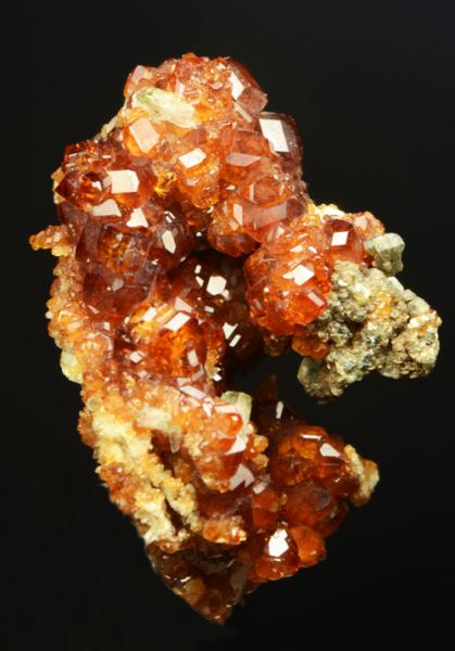 Group of xls of Hessonite, of good size and typical red colour for the alpine rodingites.The association with greenish Clinochlore is a nice add.Classic italian locale that gave some of the most beautiful alpine garnets. (Ferrero Gallery)Data last checked on 5th Jan 2022 - specimen may no longer be available