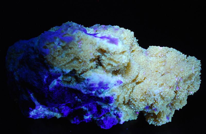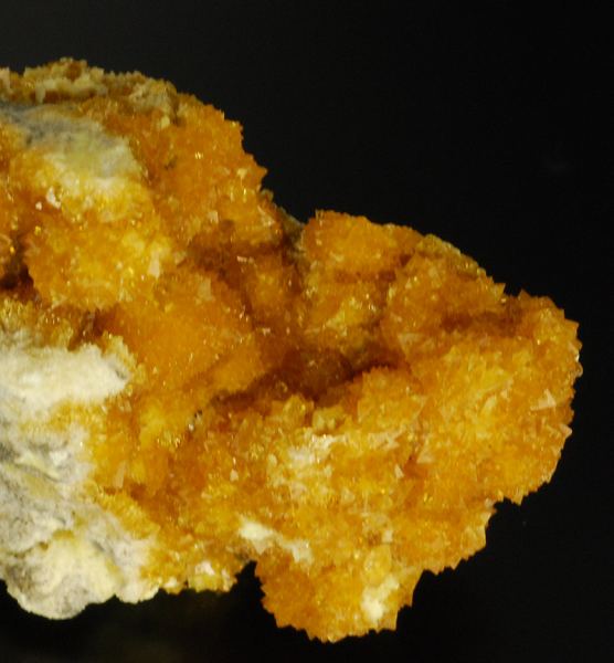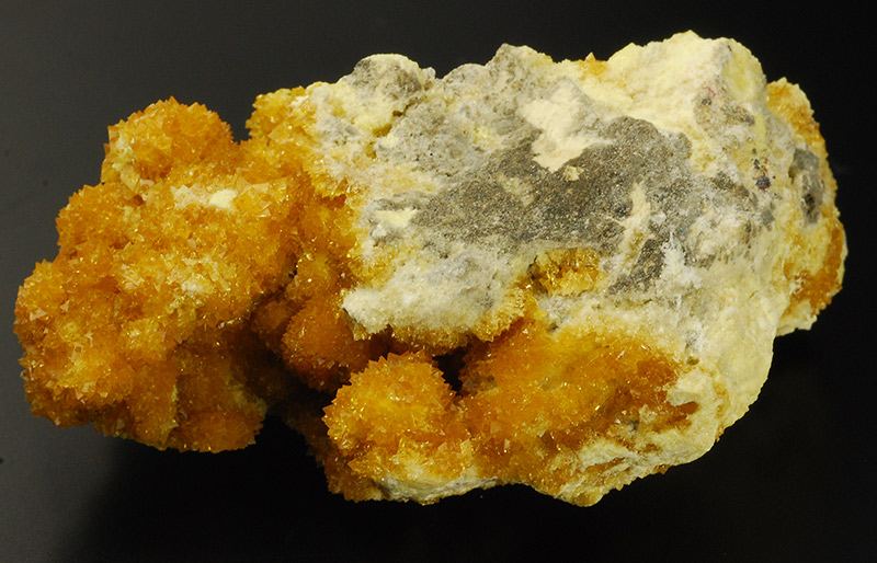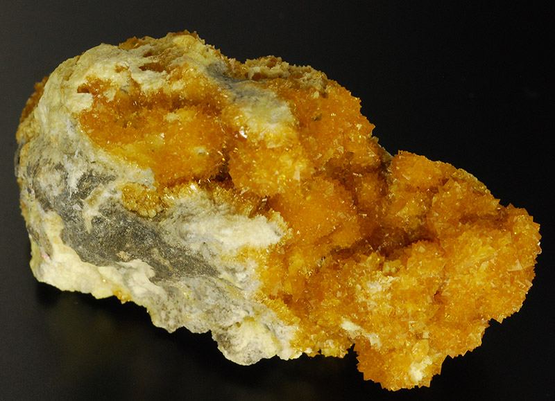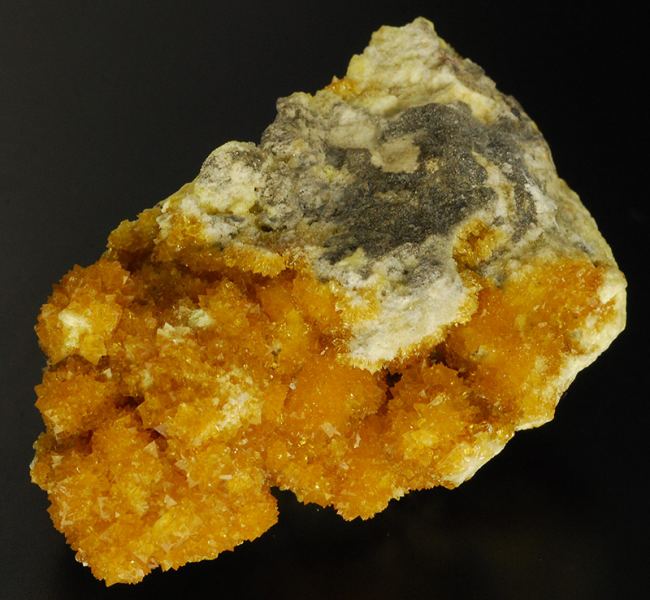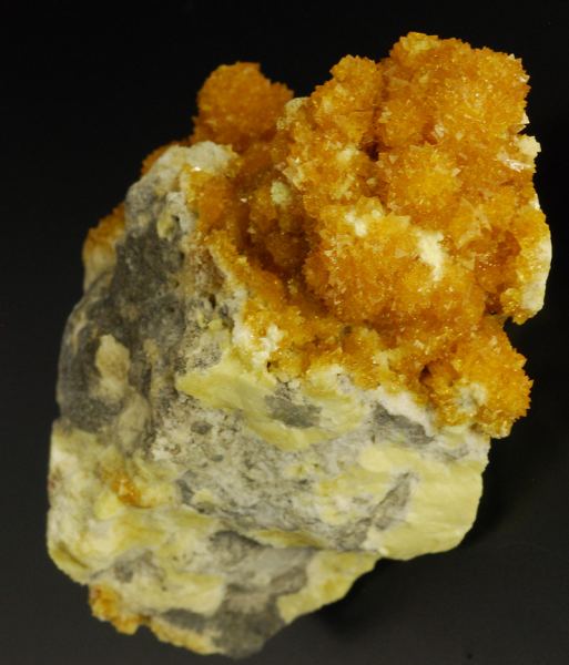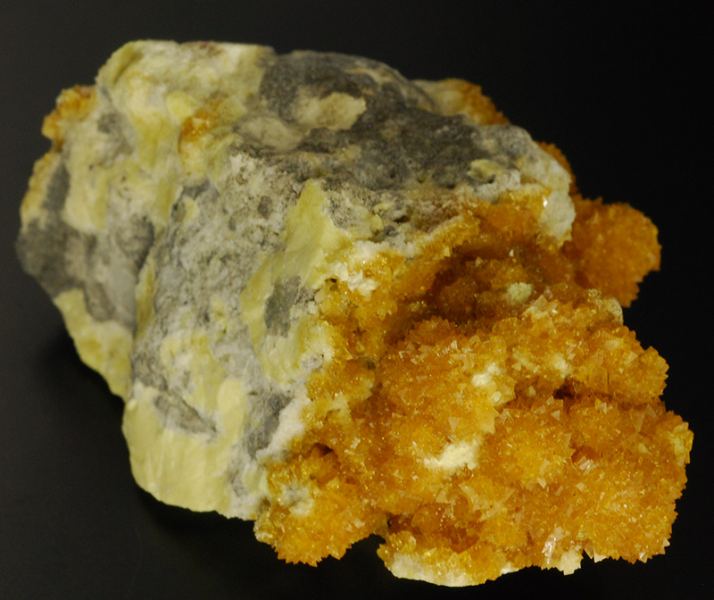 The surface of this specimen is partially covered by spheriacl aggregates of little orange colored crystals of strontianite.With the U.V. long waves they become a nice yellow color.From the ex S.Maggia Collection. (Gmineral Gallery)Data last checked on 5th Jan 2022 - specimen may no longer be available