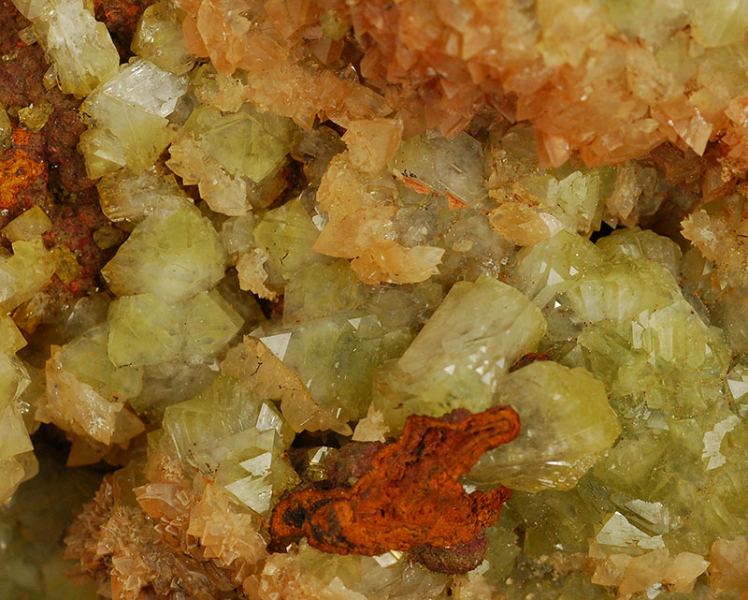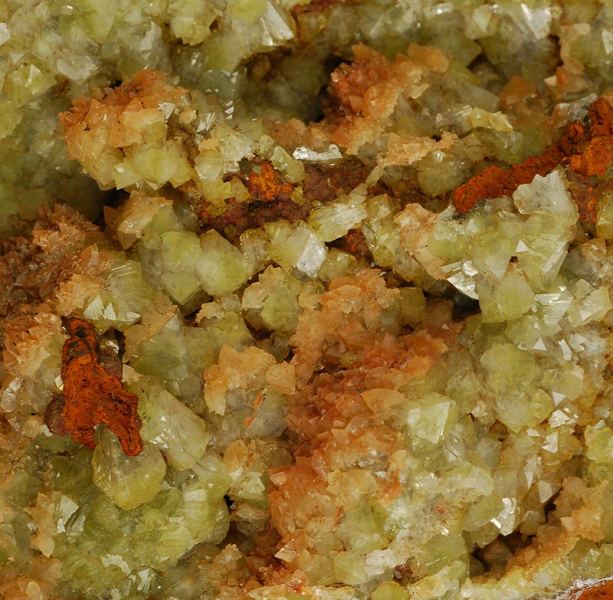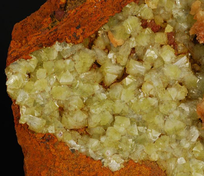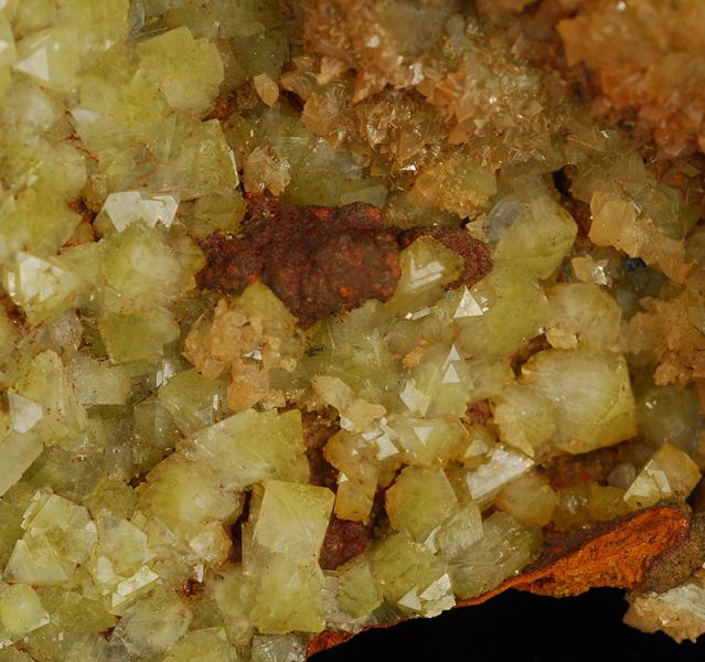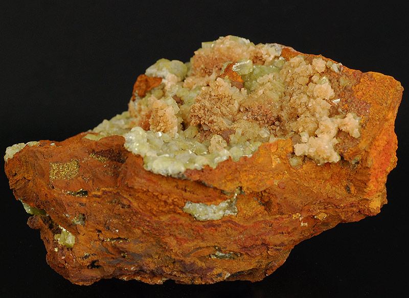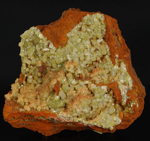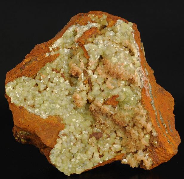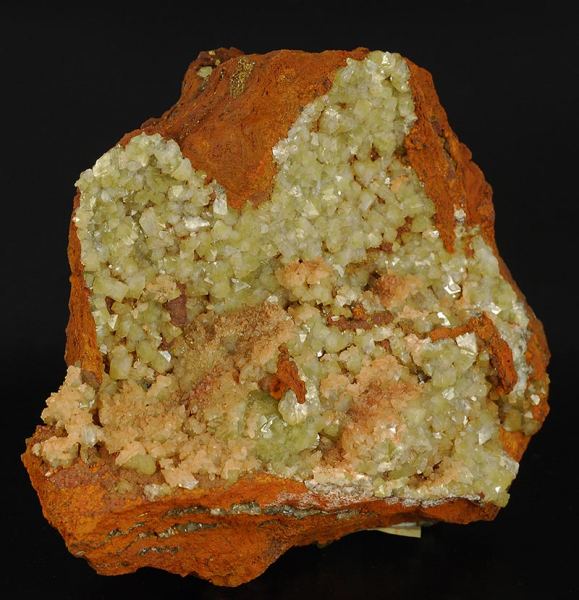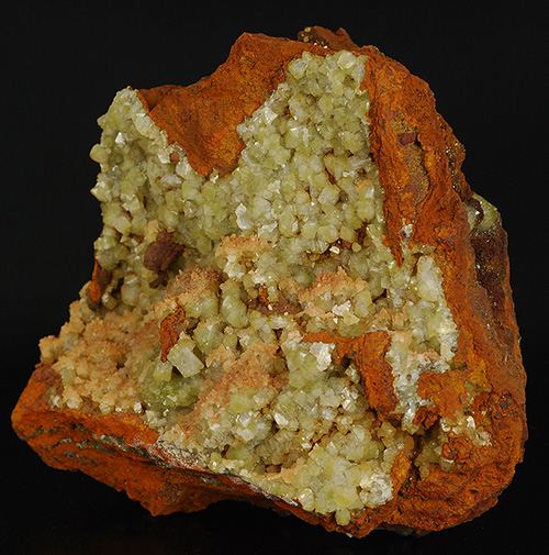 Excellent cluster that is almost covered by almost colorless crystal of adamite: most of them have a very pale green colorThere is a strong contrast with the limonite matrix.Most of the crystals take a yellow-green color when lit w (Gmineral Gallery)Data last checked on 5th Jan 2022 - specimen may no longer be available