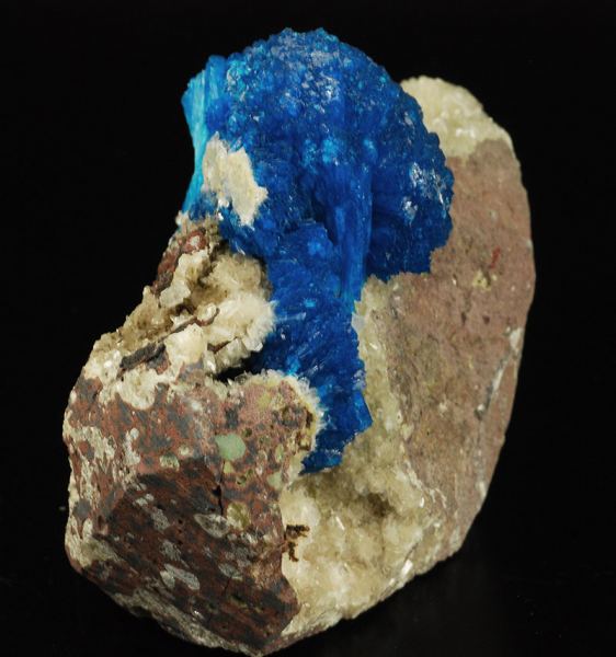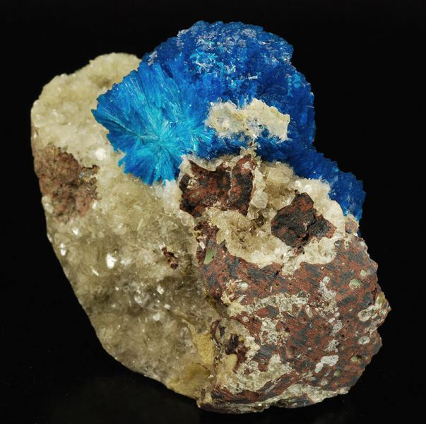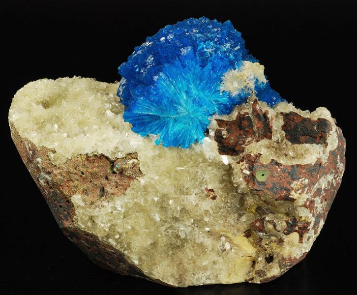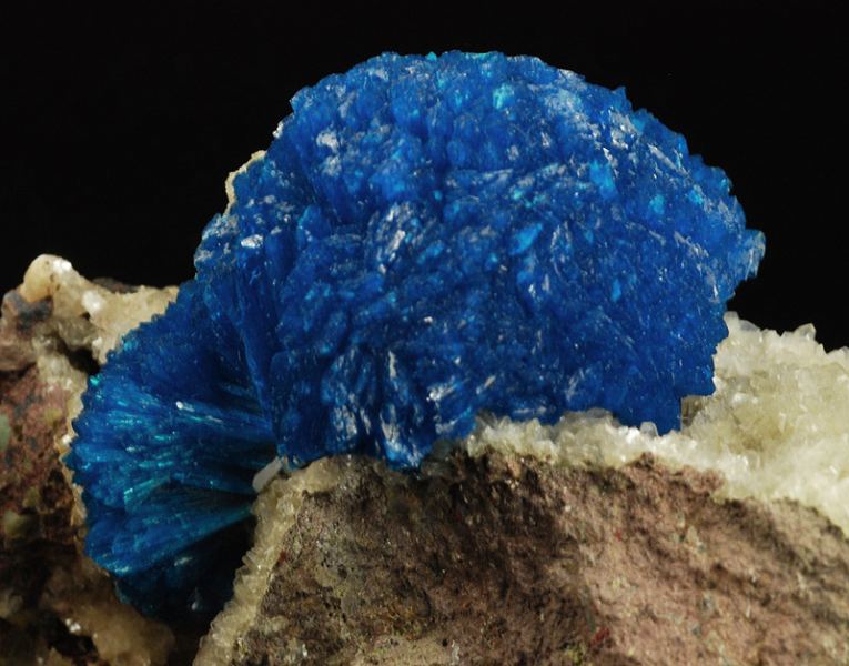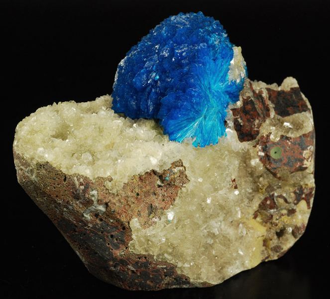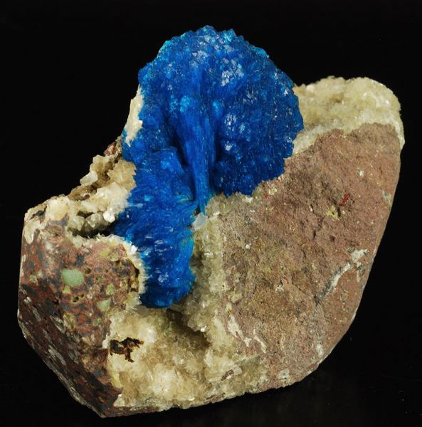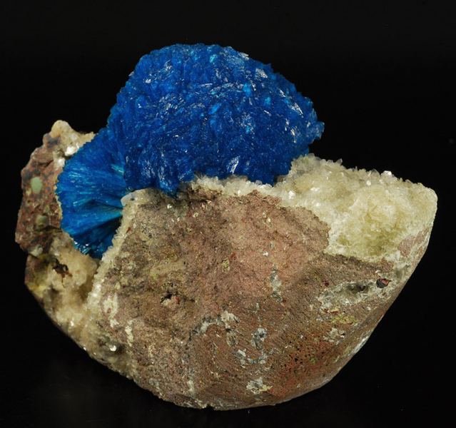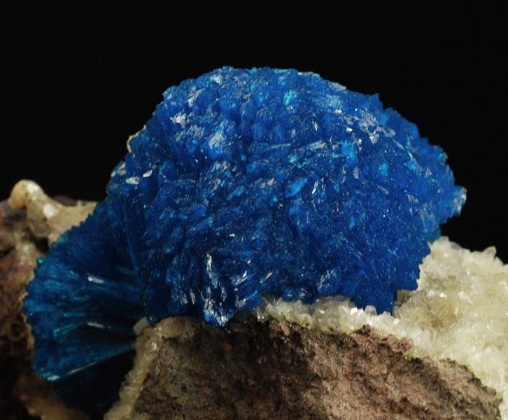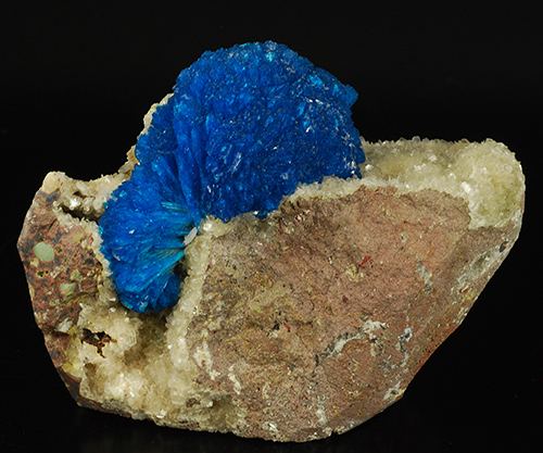 A big aggregate of several long crystals of cavansite is stunning over this cluster, surrounded by a carpet of whitish minicrystals of stilbite. (Gmineral Gallery)Data last checked on 5th Jan 2022 - specimen may no longer be available