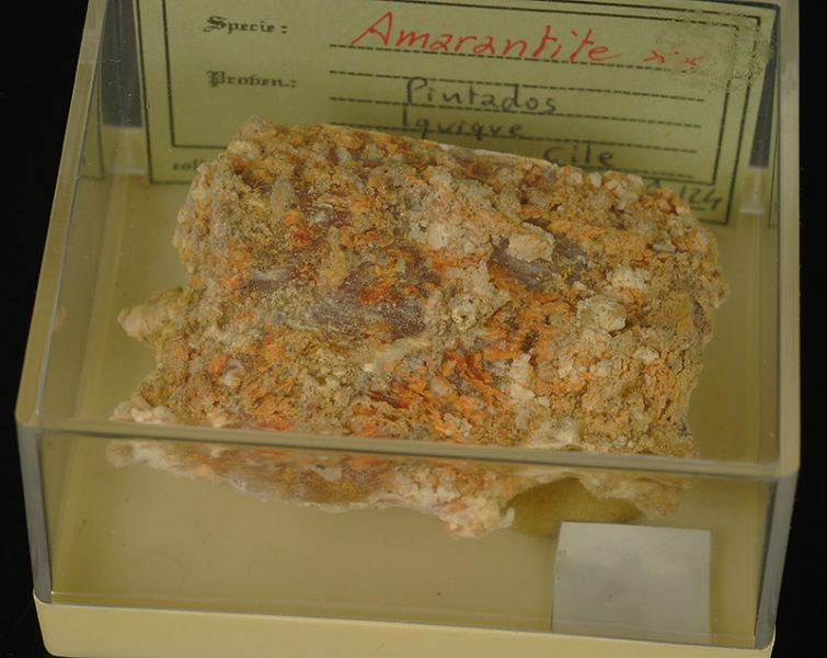 The amarantite is an uncommon iron sulphate, that often is featuring in compact specimens.In this sample there are instead several tabular crystals, with a classic orange color.From the ex collection of S.Maggia, with the original (Gmineral Gallery)Data last checked on 5th Jan 2022 - specimen may no longer be available