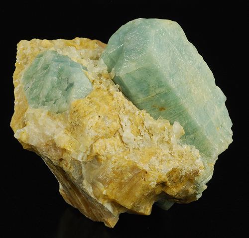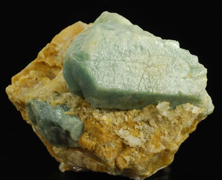 A big, azur-green colored crystal of fluorapatite is stunning over the matrix.Some traces of athers fluorapatites are visible too. (Gmineral Gallery)Data last checked on 5th Jan 2022 - specimen may no longer be available