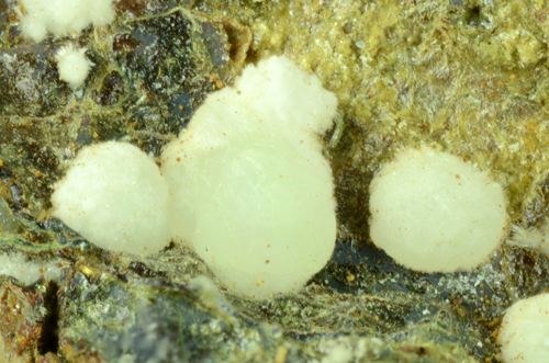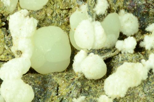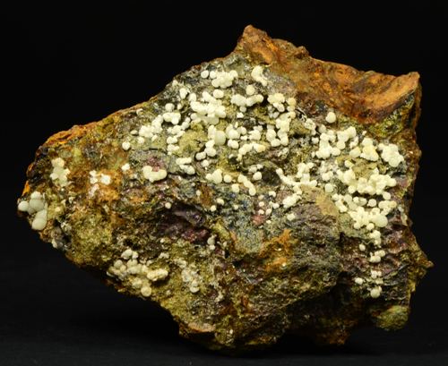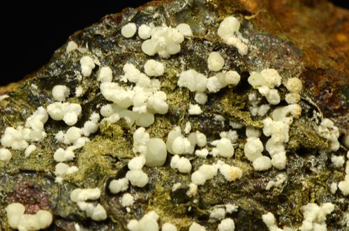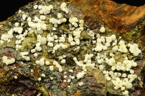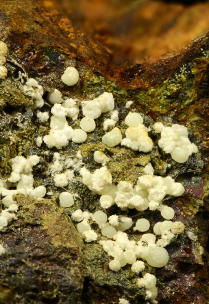 A rich array of Planerite in white-greenish spheres is scattered atop this piece.Planerite is a quite rare Al bearing phosphate, known only in very few locales in the world.The Planerite spheres are associated to another mineral, i (Ferrero Gallery)Data last checked on 5th Jan 2022 - specimen may no longer be available