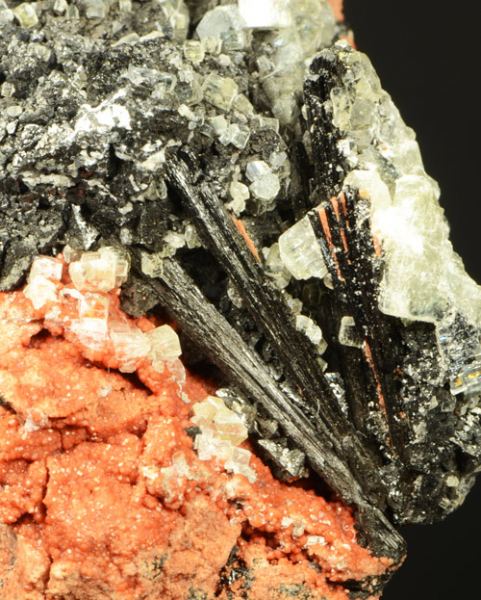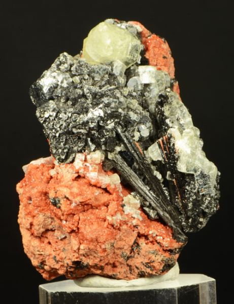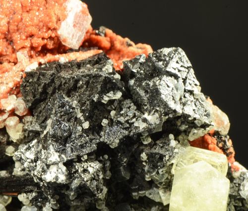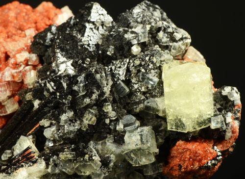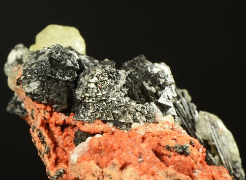 Sample with association of hexagonal prismatic crystals of yellowish Ettringite, black octahedra of very bright Haussmannite, and elongated fibrous crystals of black Gaudefroyite.All on a reddish matrix.A classic South African comb (Ferrero Gallery)Data last checked on 5th Jan 2022 - specimen may no longer be available
