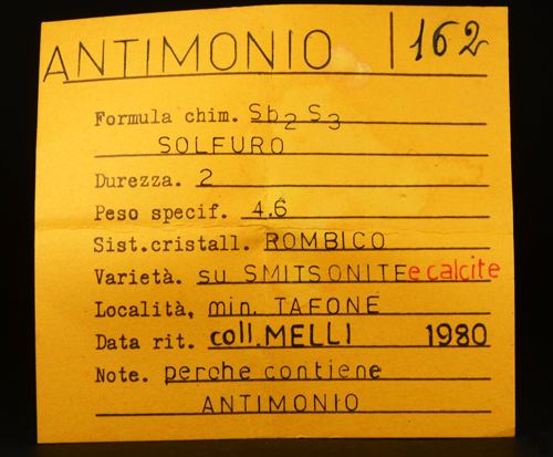 Spray of elongated gray Stibine crystals, well terminated.Not at the level of the famous chinese or japanese specimens, but interesting for the italian topology.Former Fregosi collection, with label. (Ferrero Gallery)Data last checked on 5th Jan 2022 - specimen may no longer be available