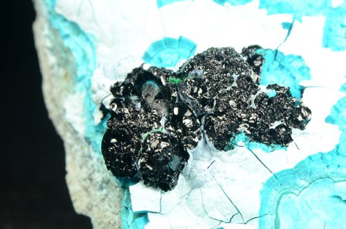Specimen featuring an array of lustrous, black bubbly heterogenite botryoids. The crystals rest on a turquoise-blue and green Chrysocolla matrix creating a nice contrast. (Ferrero Gallery)Data last checked on 5th Jan 2022 - specimen may no longer be available