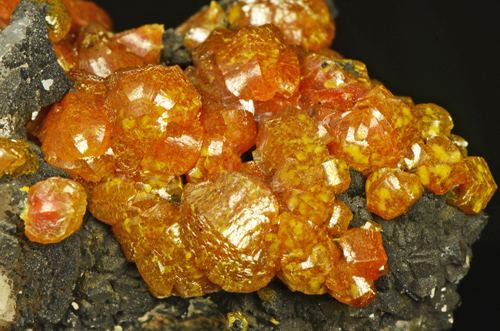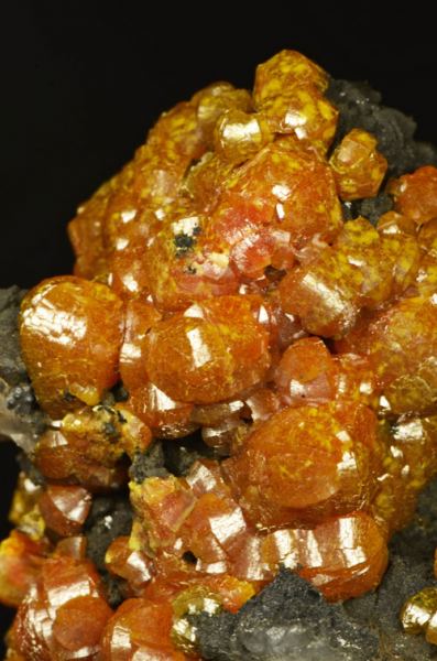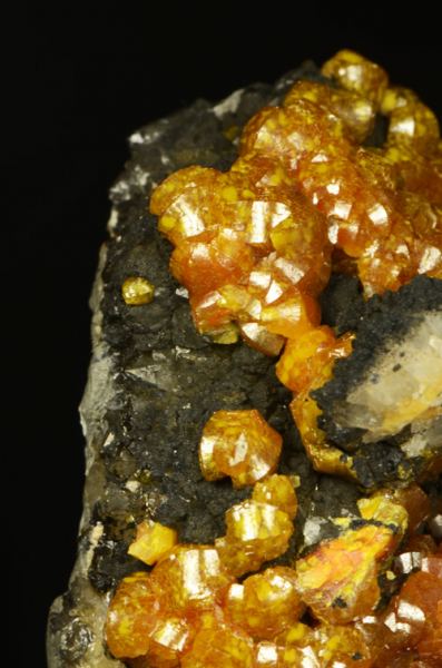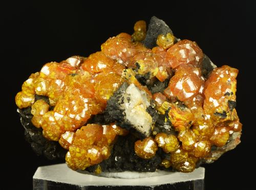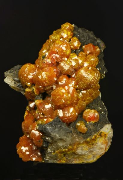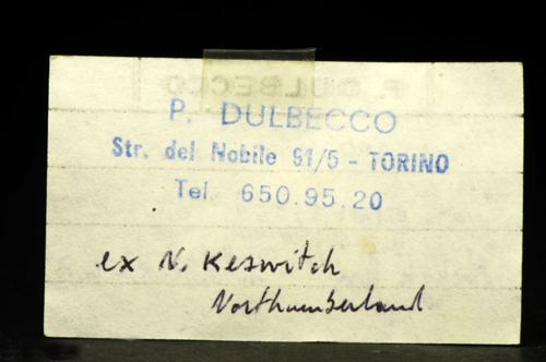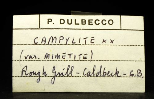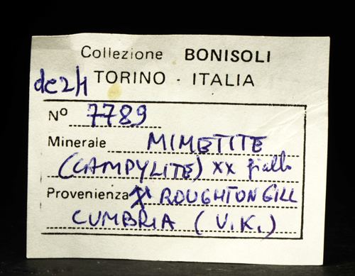 Cluster featuring several orange barrel shaped crystals of campylite, variety of mimetite, spread over matrix from the classic british locality in the Caldbeck Fells district.Former collection Bonisoli and P. Dulbecco, with labels. (Ferrero Gallery)Data last checked on 5th Jan 2022 - specimen may no longer be available