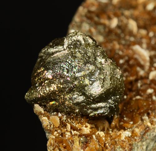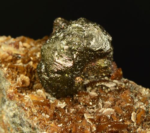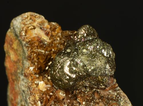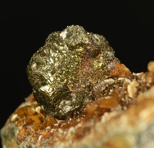 A globular aggregate of many cubic crystals of golden Marcasite is sitting on a base of brown Siderite rombohedra. Unusual specimen completing the paragenesis of an italian locality more known for others sulphides like the Meneghinite. (Ferrero Gallery)Data last checked on 5th Jan 2022 - specimen may no longer be available