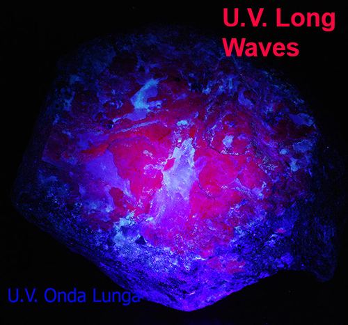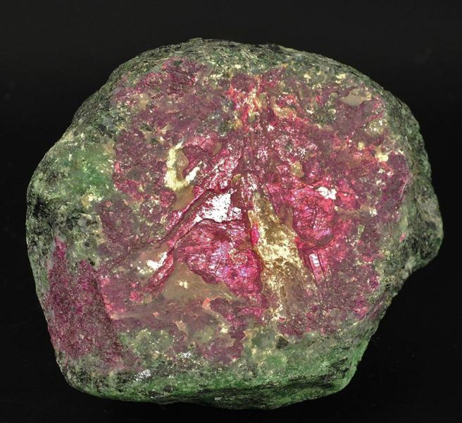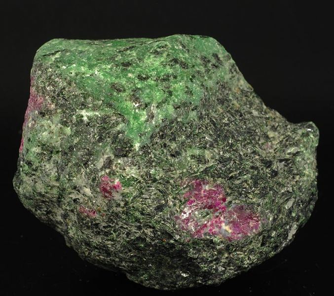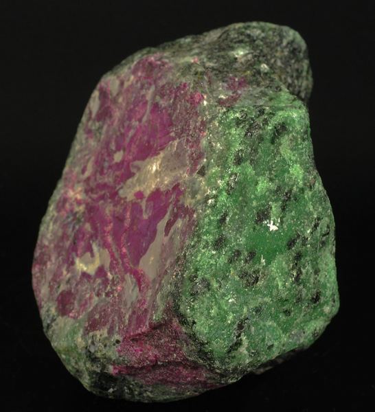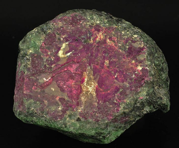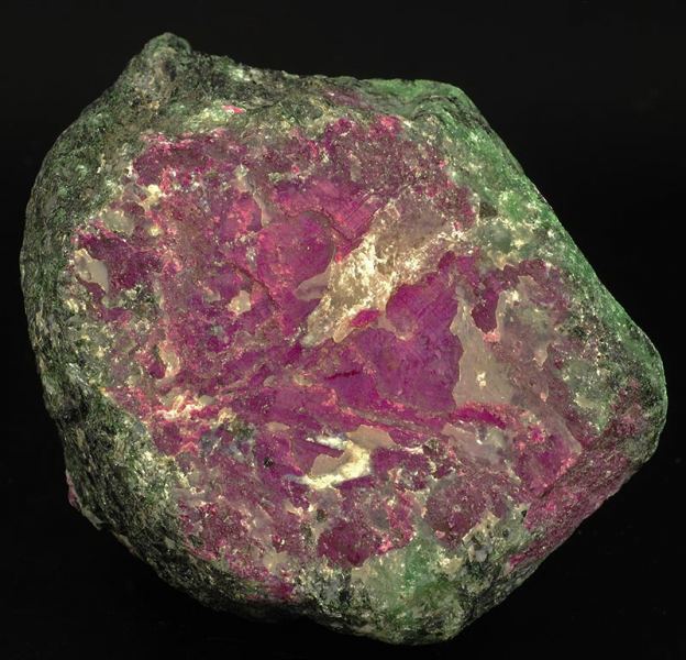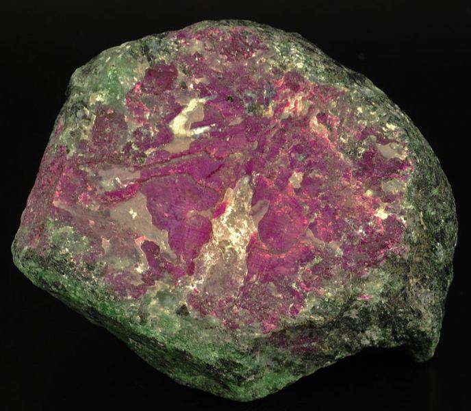 A big, red purple colored lump of ruby is incorporated in a green matrix of zoisite.At the U.V. long waves light it shoots to a shocking red.The ruby is the red variety of the corundum. (Gmineral Gallery)Data last checked on 5th Jan 2022 - specimen may no longer be available