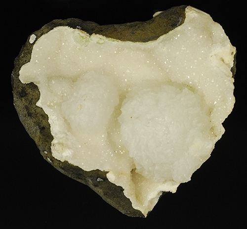 This 'heart shaped' druse is covered by colorless and semitransparent crystals of quartz.Over this carpet, two big and rounded crystals of goosecreekite are featuring.The main has 40 mm. of diameter.Ther is no contrast because al (Gmineral Gallery)Data last checked on 5th Jan 2022 - specimen may no longer be available