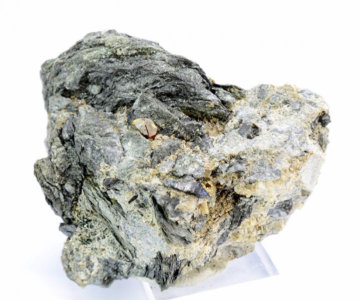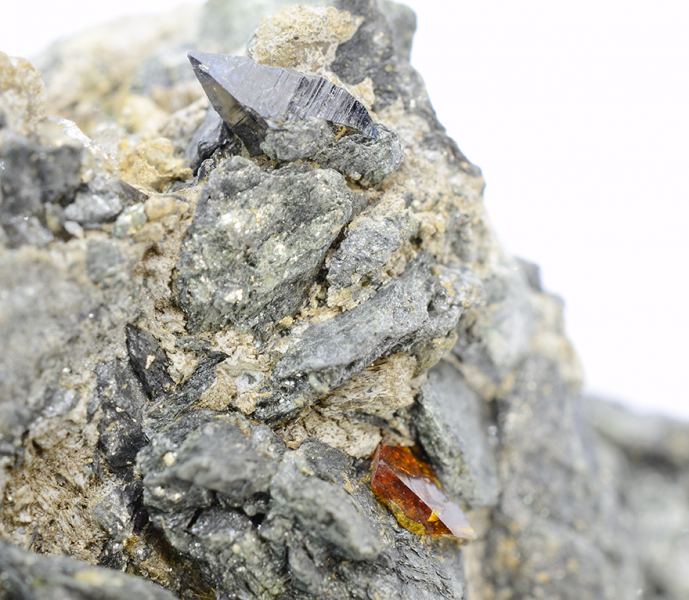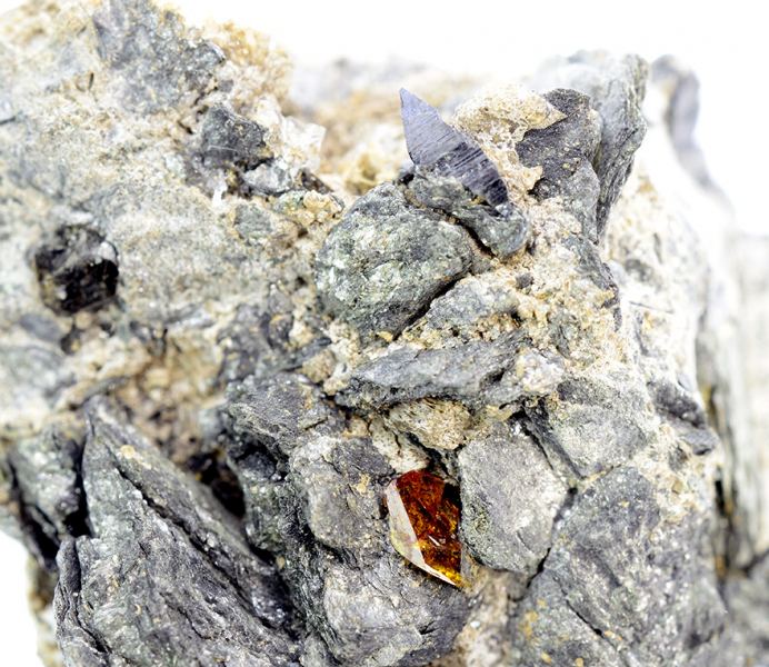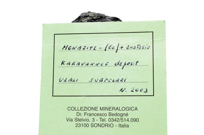 A Monazite-(Ce) crystal with adamantine luster 4,5 mm wide is set nicely on matrix with Anatase 6 mm tall in assocation. Nice combo from a remote location. Ex Francesco Bedognè coll. n. 2003 with label. (Minservice Gallery)Data last checked on 5th Jan 2022 - specimen may no longer be available