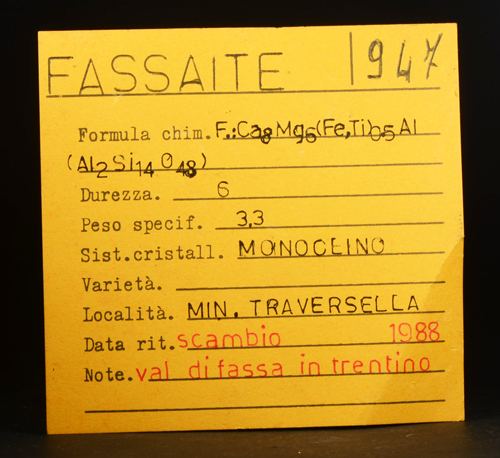 Sharp, chisel ended, deep green Fassaite chrystals on matrix.Very well represented for the specie.Former collection Fregosi, with label. (Ferrero Gallery)Data last checked on 5th Jan 2022 - specimen may no longer be available