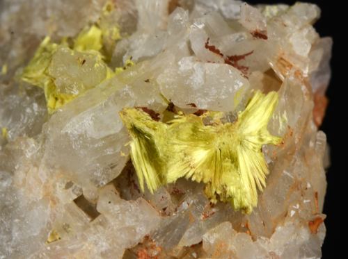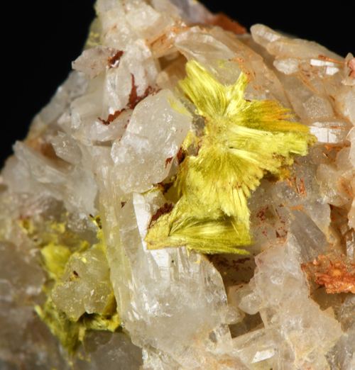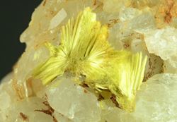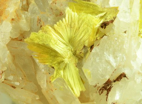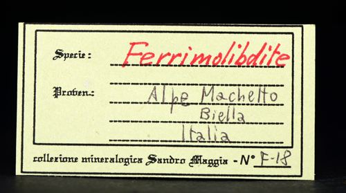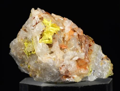 A specimen of quartz with a vug which has originated a nice coverage of yellow tuffs of Ferrymolibdite.A rare italian classic, very well represented!Former collection Sandro Maggia, with label. (Ferrero Gallery)Data last checked on 5th Jan 2022 - specimen may no longer be available