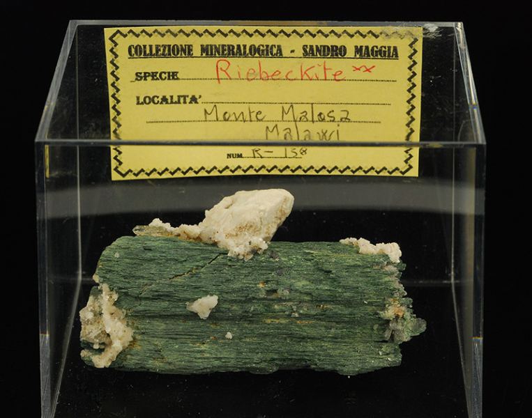 A unique big crystal of riebeckite, a floater without matrix.Some little fragment of orthoclase and some little hyalin quartzes are joint to it.Ex Sandro Maggia collection with the original label. (Gmineral Gallery)Data last checked on 5th Jan 2022 - specimen may no longer be available
