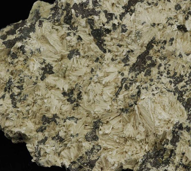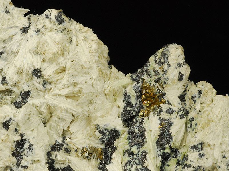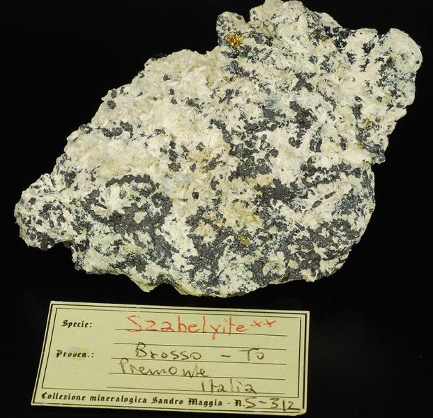 Very white tuftes of szabelyite are spread all over the black ludwigite.It's typical from this famous alpine mine.It's crystallized all around.A lttle aggregate of golden pyrites gives a touch of color.Ex Sandro Maggia collecti (Gmineral Gallery)Data last checked on 5th Jan 2022 - specimen may no longer be available