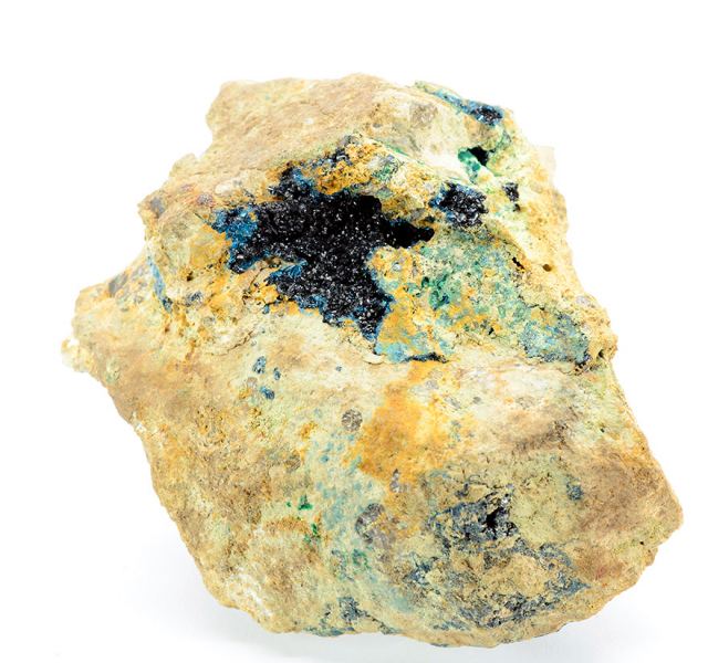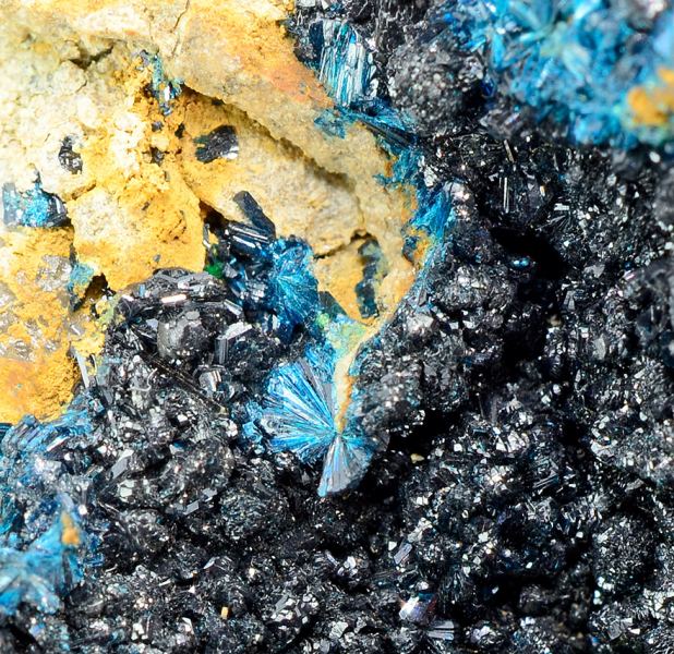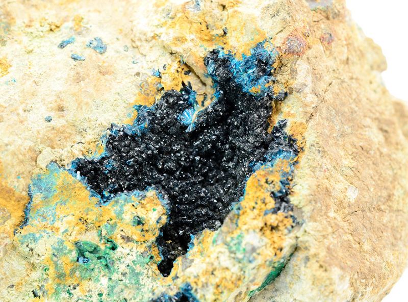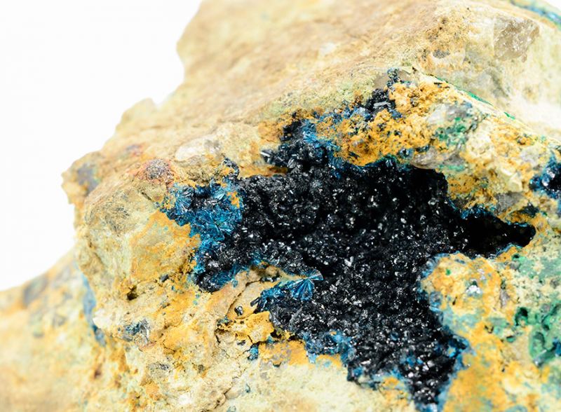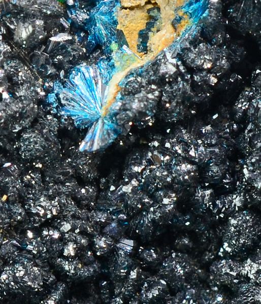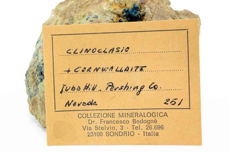 Dark blue crystals of clinoclase on matrix, up to 1-2 mm with mino green cornwallite in association.Ex Francesco Bedognè coll. #251. - Turin m (Minservice GalleryData last checked on 5th Jan 2022 - specimen may no longer be available