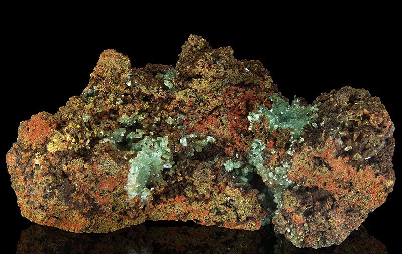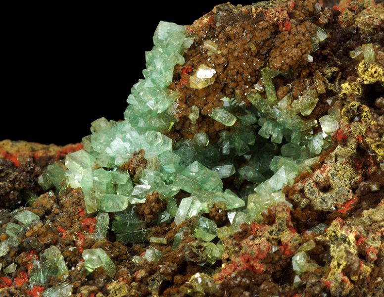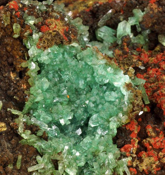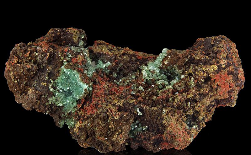 Nice brilliant green cuprian adamite xls on limonite matrix. (Rolando Gallery)Data last checked on 5th Jan 2022 - specimen may no longer be available