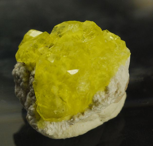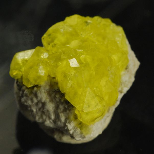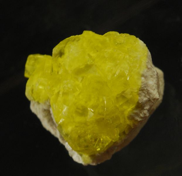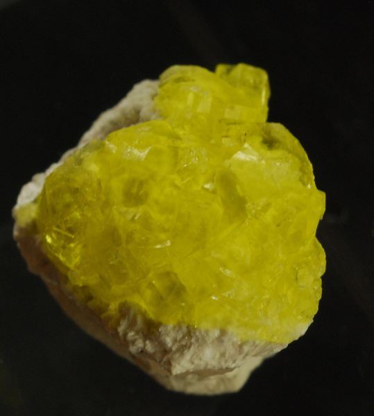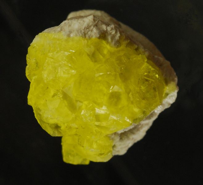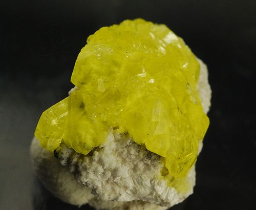 An aggregate made by semitransparent, lemon-yellow colored and brilliant crystals of jouravskite is in good evidence over a bit of matrix. (Gmineral Gallery)Data last checked on 5th Jan 2022 - specimen may no longer be available