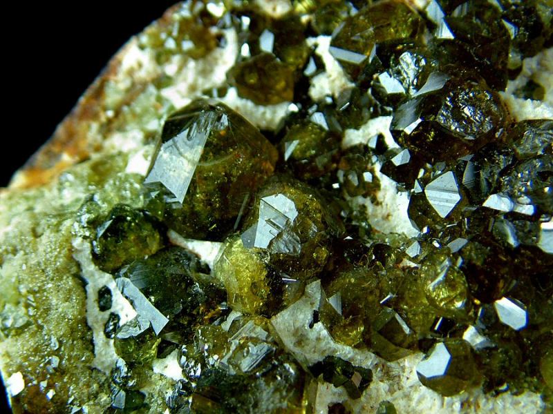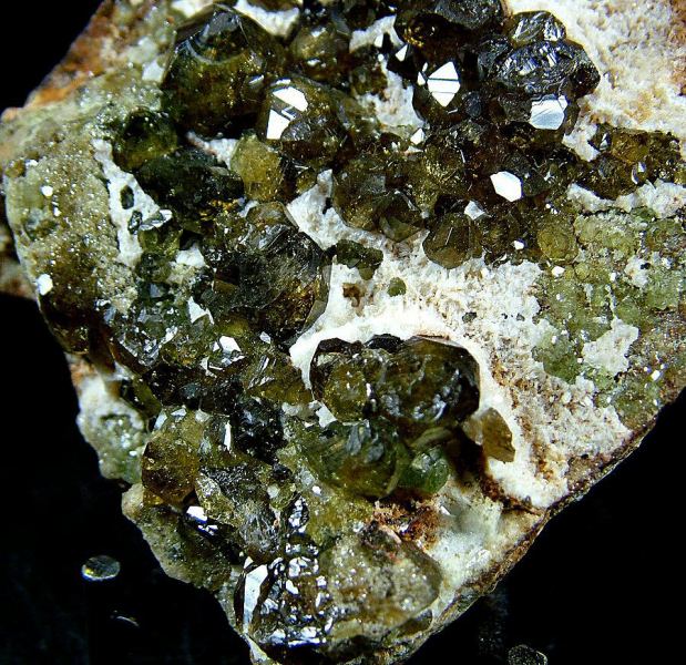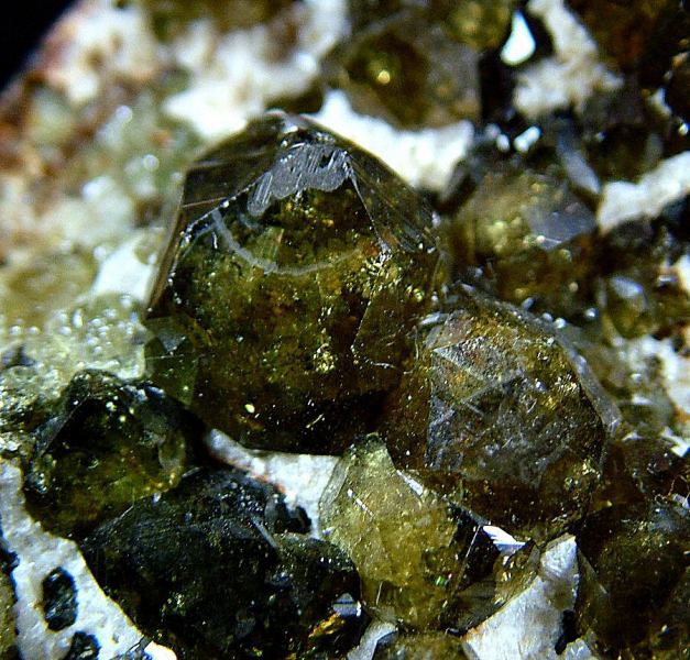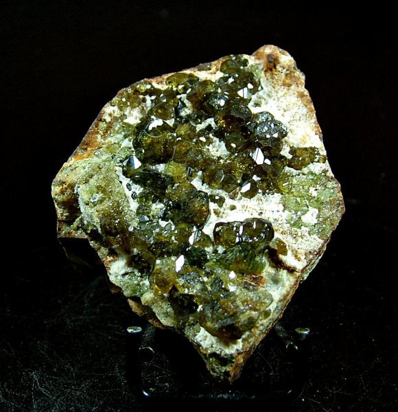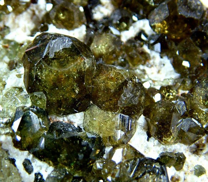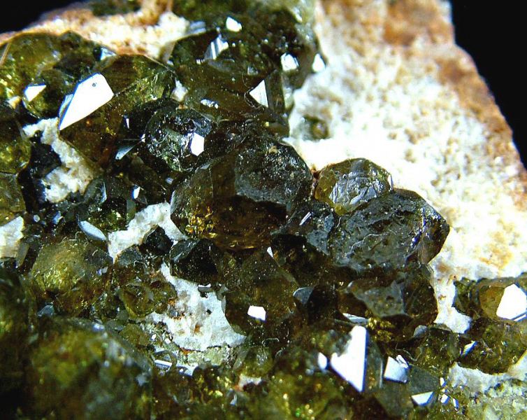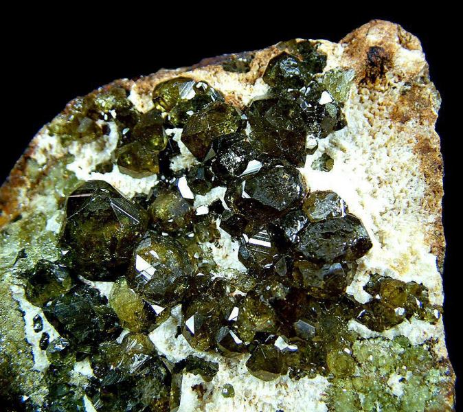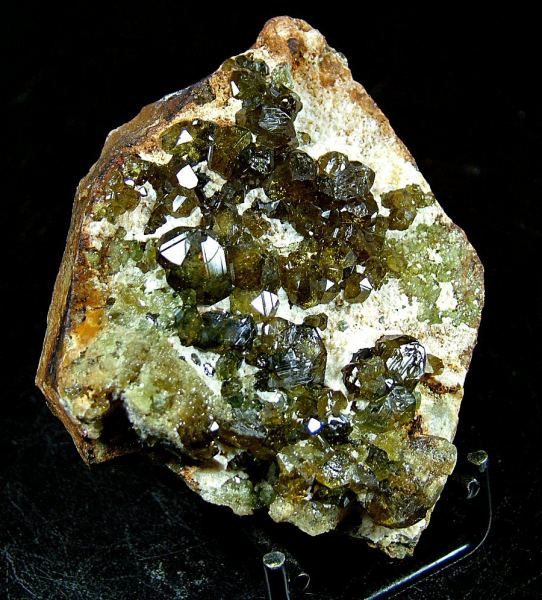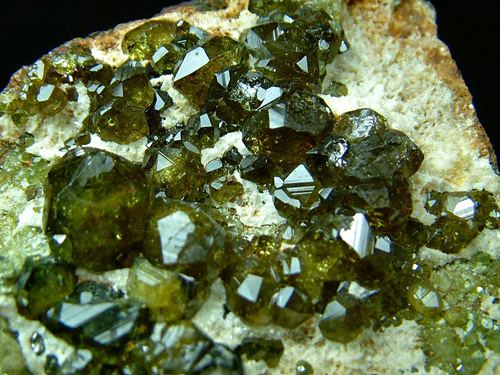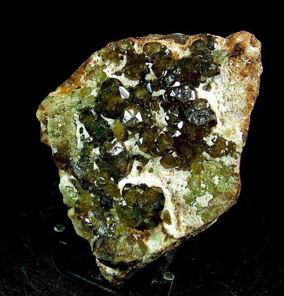 Cluster of glossy Topazolite's crystals. The color is like cognac with warm light, and brown-olive with cool light (between Topazolite and Demantoid). The crystals stand out well on the metamorphosed limestone's matrix. (Silvia Gallery)Data last checked on 5th Jan 2022 - specimen may no longer be available