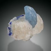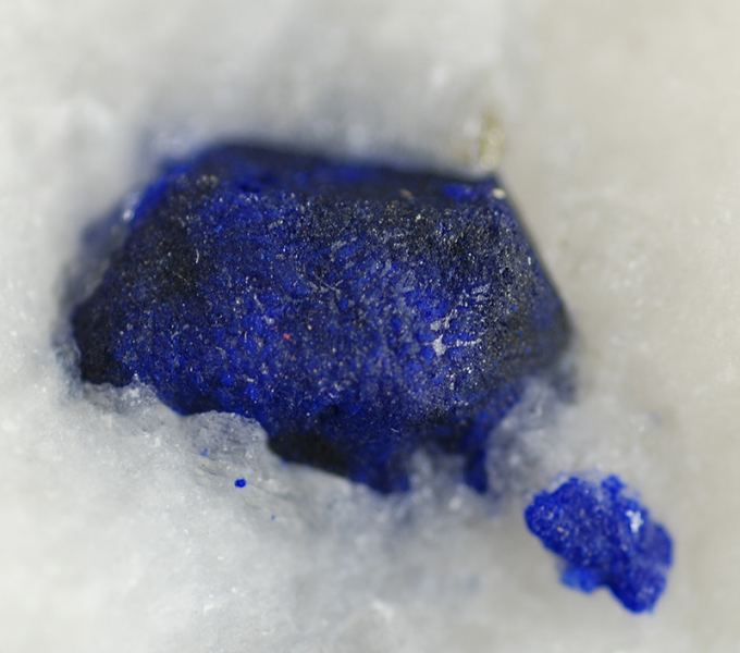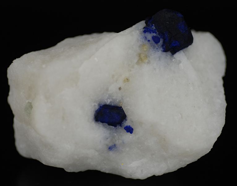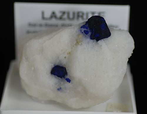 Two dark blue colored crystals of lazurite are in good evidence over the white marble of the matrix.There is a strong contrast of color. (Gmineral Gallery)Data last checked on 5th Jan 2022 - specimen may no longer be available