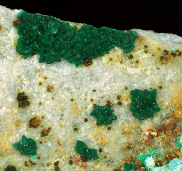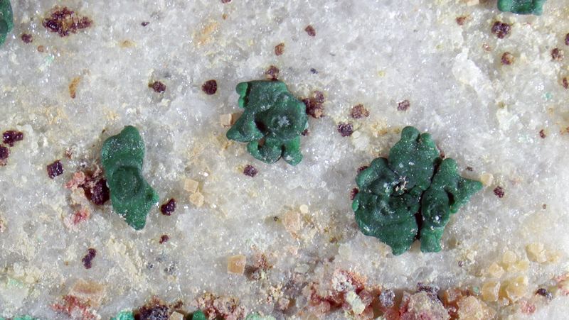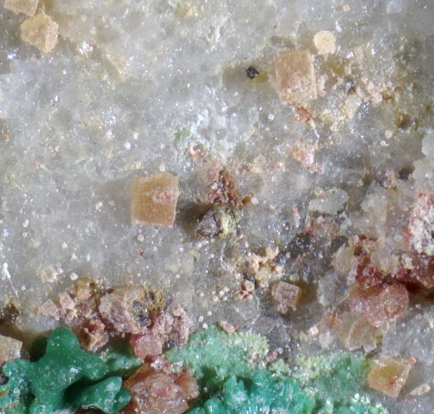 Nice creamy pharmacosiderite cubes with globular malachite and carminite xls on matrix. (Rolando Gallery)Data last checked on 5th Jan 2022 - specimen may no longer be available